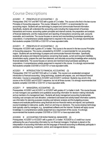 Course Descriptions ACG2001 P PRINCIPLES OF ACCOUNTING 1 (3) Prerequisites: ENC1101 and MAT1033 with a grade of C or better. This course is the first in the two-course Principles of Accounting sequence. This course, followed by ACG2011, is recommended for nonaccounting majors. Students will use technology to prepare and communicate financial information. Specifically, students will understand the accounting cycle including the measurement of business transactions and income; accounting system principles and internal controls; the preparation and analysis of financial statements; and the measurement and reporting of transactions concerning cash, accounts receivable, and inventories. The course focuses on service and merchandising businesses operating as corporations. A comprehensive outside assignment is required in this course. It is strongly recommended that students complete CGS1000 or CGS1101 or have equivalent skills. ACG2011 P PRINCIPLES OF ACCOUNTING 2 (3) Prerequisite: ACG2001 with a grade of C or better. This course is the second in the two-course Principles of Accounting sequence. This course, preceeded by ACG2001, is recommended for non-accounting majors. Students will use technology to prepare and communicate financial information. Specifically, students will analyze and interpret transactions concerning fixed assets, current and long-term liabilities, shareholders equity; prepare the cash flow statement; and articulate accounting knowledge when analyzing financial statements. The course focuses on service and merchand ising businesses operating as corporations. A comprehensive outside assignment is required in this course. It is strongly recommended that students complete CGS1000 or CGS1101 or have equivalent skills. ACG2021 P INTRODUCTION TO FINANCIAL ACCOUNTING (3) Prerequisites: ENC1101 and MAT1033 with a C or better. This course is an accelerated conceptual introduction to financial accounting. Using technology, students will prepare, use, and interpret financial information. Course is comparable to ACG2001 and ACG2011 combined. Students may enroll in this course or the ACG2001 and ACG2011 sequence, but not all three courses. It is strongly recommended that students complete CGS1000 or CGS1101 or have equivalent skills. ACG2071 P MANAGERIAL ACCOUNTING (3) Prerequisites: ACG2001 and ACG2011 or ACG2021 with grades of C or better in both. This course focuses on how managers use quantitative and qualitative accounting information for decision making individually and as members of a management team. Students will study management accounting fundamentals including cost concepts and cost allocation; understand cost-based and activity-based information systems; use information for planning purposes including cost behavior analysis and the budgeting process; measure and evaluate performance using financial and non-financial metrics and reports; and synthesize course knowledge to make price, quality, short-run and long-run decisions. The course employs technology tools typically used by managers, e.g., spreadsheet software and the Internet. Students will apply course knowledge in a comprehensive outside assignment as a requirement of this course. It is strongly recommended that students complete CGS1000 or CGS1101 or have equivalent skills. ACG3024 B ACCOUNTING FOR NON-FINANCIAL MANAGERS (3) Prerequisites: ACG2001 or ACG2021 with a grade of C or better. ACG3024 is a 3 credit hour course addressing the use of accounting information by non-financial managers. Emphasis is placed on the interpretation of accounting information and the language of financial accounting to effectively participate in activities such as planning, investment, control, and managerial decision making. 141