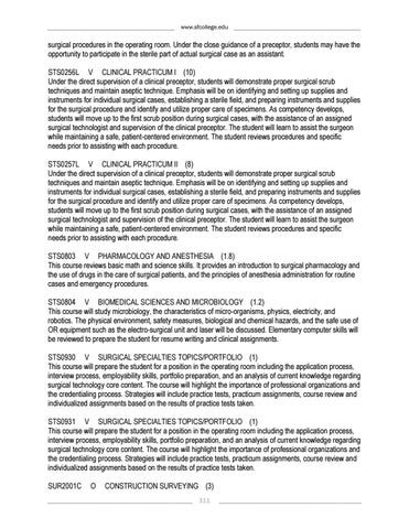 surgical procedures in the operating room. Under the close guidance of a preceptor, students may have the opportunity to participate in the sterile part of actual surgical case as an assistant. STS0256L V CLINICAL PRACTICUM I (10) Under the direct supervision of a clinical preceptor, students will demonstrate proper surgical scrub techniques and maintain aseptic technique. Emphasis will be on identifying and setting up supplies and instruments for individual surgical cases, establishing a sterile field, and preparing instruments and supplies for the surgical procedure and identify and utilize proper care of specimens. As competency develops, students will move up to the first scrub position during surgical cases, with the assistance of an assigned surgical technologist and supervision of the clinical preceptor. The student will learn to assist the surgeon while maintaining a safe, patient-centered environment. The student reviews procedures and specific needs prior to assisting with each procedure. STS0257L V CLINICAL PRACTICUM II (8) Under the direct supervision of a clinical preceptor, students will demonstrate proper surgical scrub techniques and maintain aseptic technique. Emphasis will be on identifying and setting up supplies and instruments for individual surgical cases, establishing a sterile field, and preparing instruments and supplies for the surgical procedure and identify and utilize proper care of specimens. As competency develops, students will move up to the first scrub position during surgical cases, with the assistance of an assigned surgical technologist and supervision of the clinical preceptor. The student will learn to assist the surgeon while maintaining a safe, patient-centered environment. The student reviews procedures and specific needs prior to assisting with each procedure. STS0803 V PHARMACOLOGY AND ANESTHESIA (1.8) This course reviews basic math and science skills. It provides an introduction to surgical pharmacology and the use of drugs in the care of surgical patients, and the principles of anesthesia administration for routine cases and emergency procedures. STS0804 V BIOMEDICAL SCIENCES AND MICROBIOLOGY (1.2) This course will study microbiology, the characteristics of micro-organisms, physics, electricity, and robotics. The physical environment, safety measures, biological and chemical hazards, and the safe use of OR equipment such as the electro-surgical unit and laser will be discussed. Elementary computer skills will be reviewed to prepare the student for resume writing and clinical assignments. STS0930 V SURGICAL SPECIALTIES TOPICS/PORTFOLIO (1) This course will prepare the student for a position in the operating room including the application process, interview process, employability skills, portfolio preparation, and an analysis of current knowledge regarding surgical technology core content. The course will highlight the importance of professional organizations and the credentialing process. Strategies will include practice tests, practicum assignments, course review and individualized assignments based on the results of practice tests taken. STS0931 V SURGICAL SPECIALTIES TOPICS/PORTFOLIO (1) This course will prepare the student for a position in the operating room including the application process, interview process, employability skills, portfolio preparation, and an analysis of current knowledge regarding surgical technology core content. The course will highlight the importance of professional organizations and the credentialing process. Strategies will include practice tests, practicum assignments, course review and individualized assignments based on the results of practice tests taken. SUR2001C