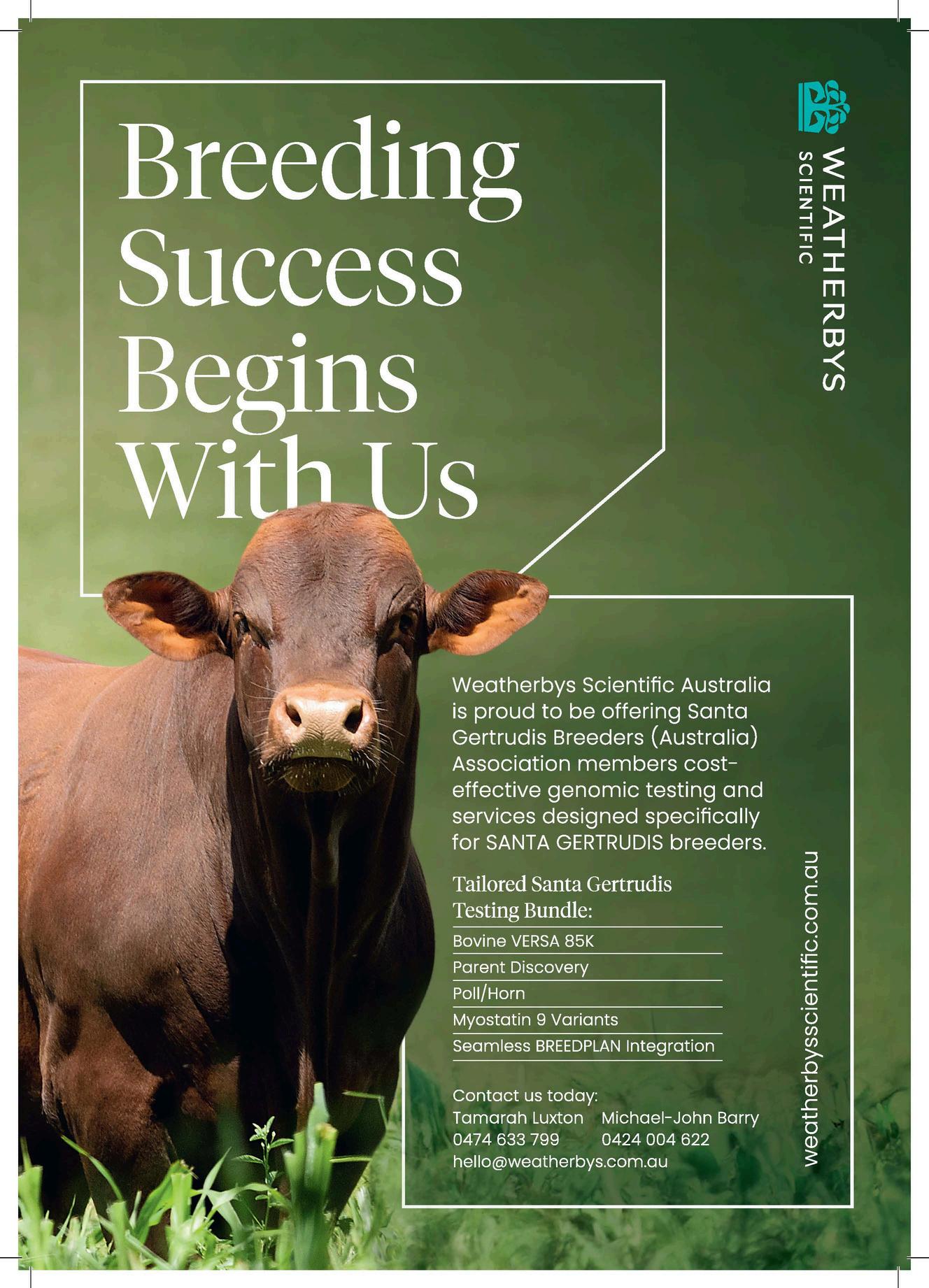 Withbullsalesinfullswingthismonth,the SantaGertrudisBreeders(Australia) Associationremainscommittedtosupporting membersontheground.