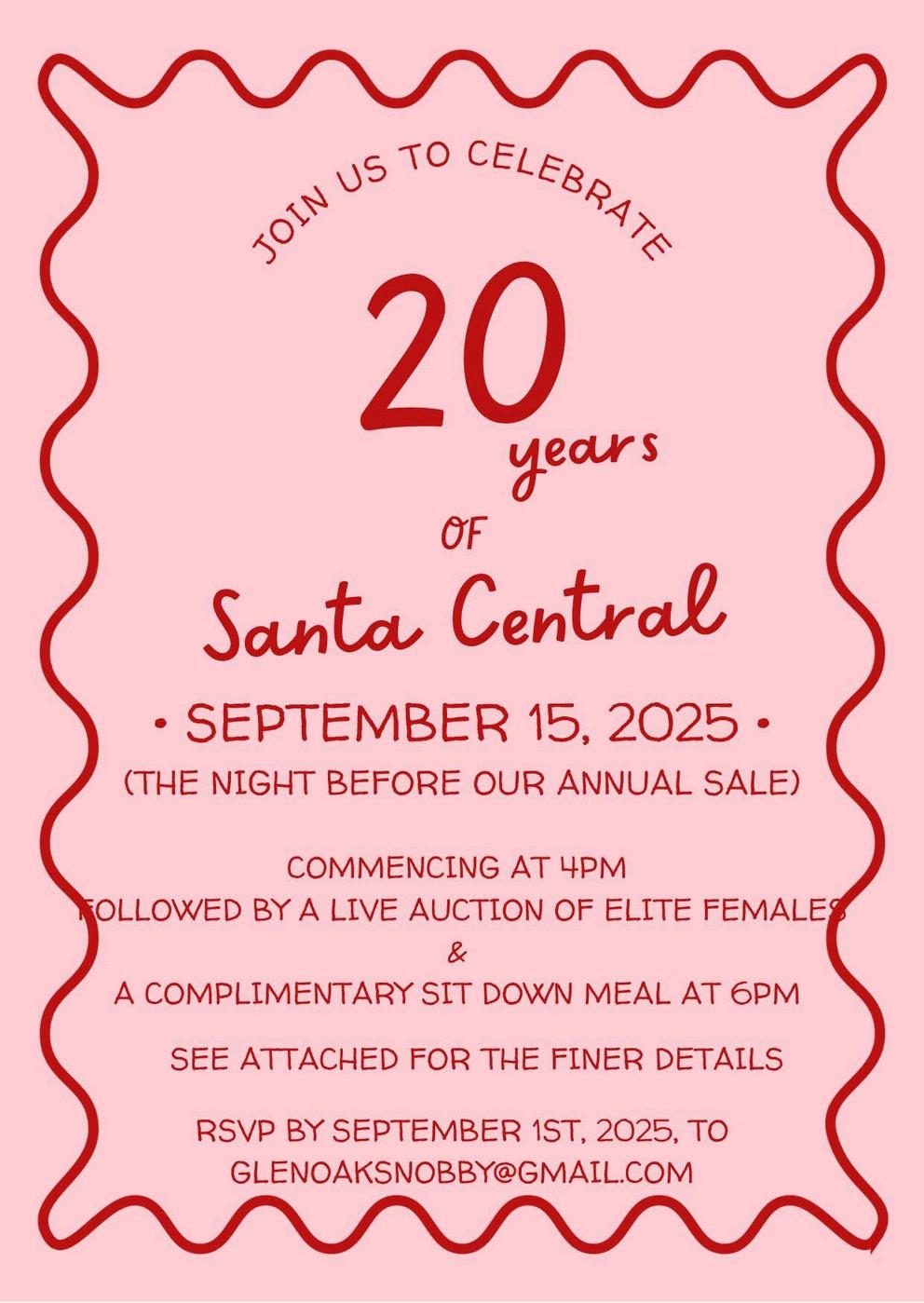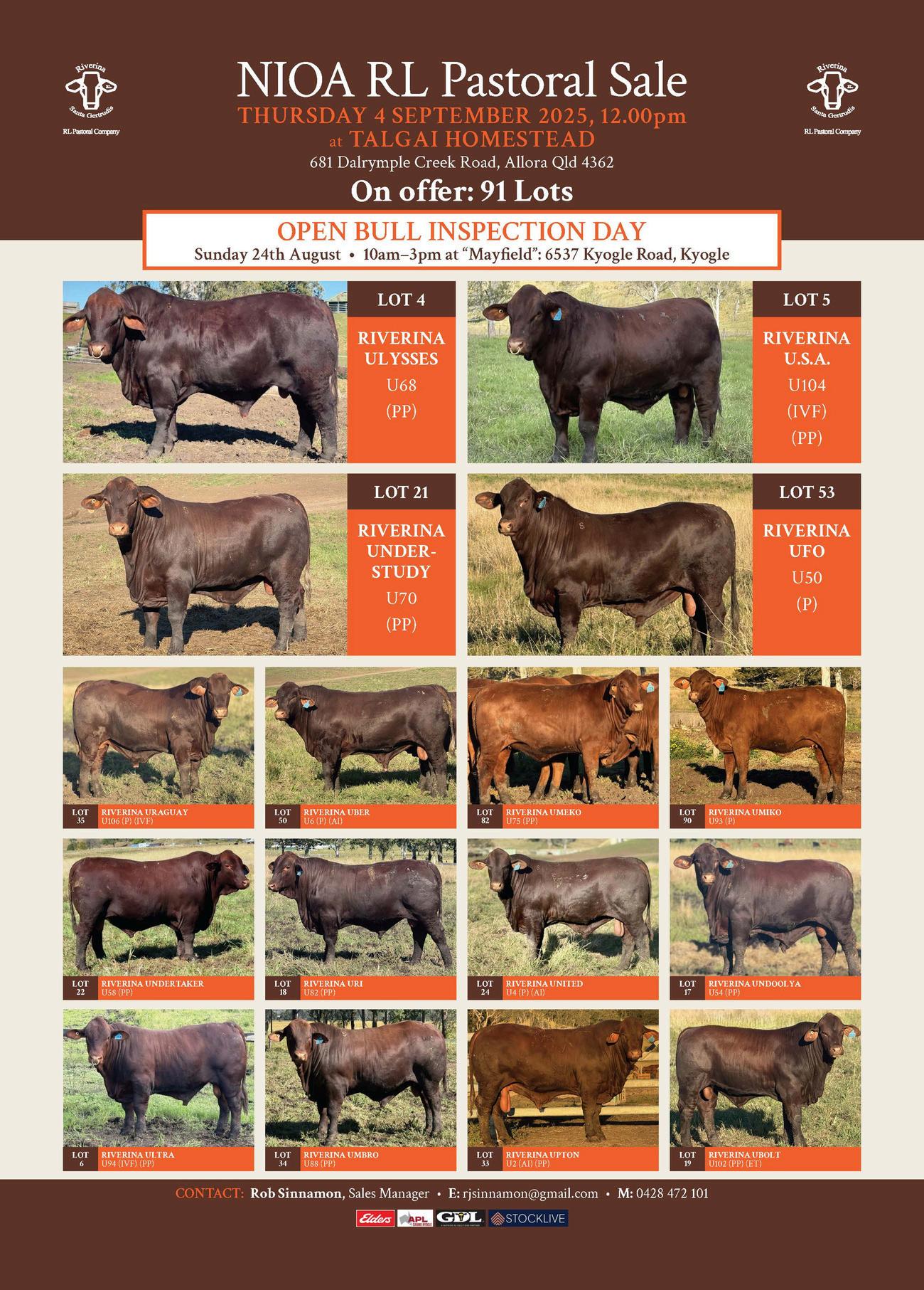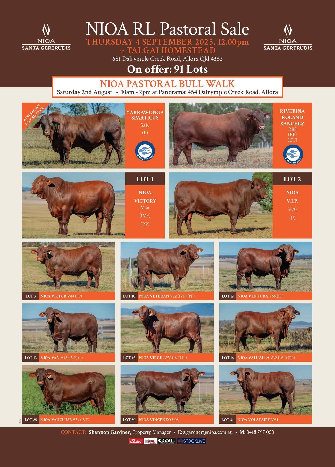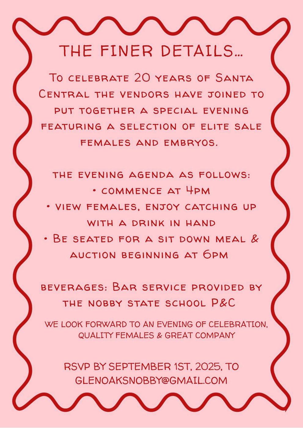 Thecelebrationcontinueswitha complimentarysit-downdinnerand beverages,followedbytheEliteFemale Auctionat6pm,whichwillalso showcasethreeexclusiveembryo packages. Representedinthefemalelineupare geneticsfromleadingstuds: GlennOaks,DiamondH,Kilcock, Warenda,andWaveHill,atestamentto thequalityanddiversitySantaCentralis knownfor RSVPshavebeenextendeduntilFriday, September5. Toconfirmyourattendance,please email:glenoaksnobby@gmail.com