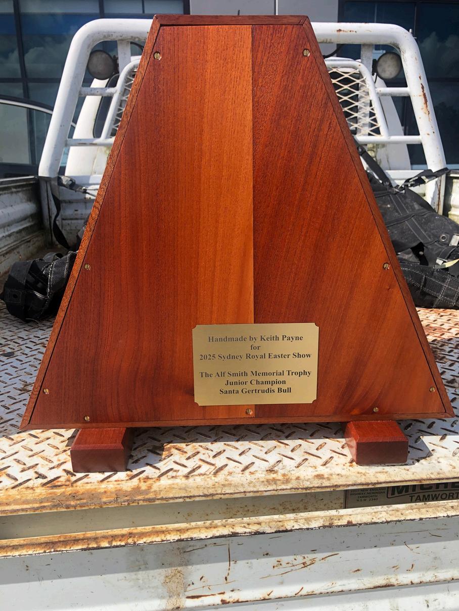 TheAlfSmithMemorialTrophyisdonated eachyearbyGeoffandLindaPayne, BarrabaSantaGertrudisStud,Quorrobolong, southofCessnockintheNSWHunterValley, inmemoryofLinda’sfather,AlfSmith,who beganBarrabaSantaGertrudisstudin1980, togetherwithhiswife,Jeanette.
