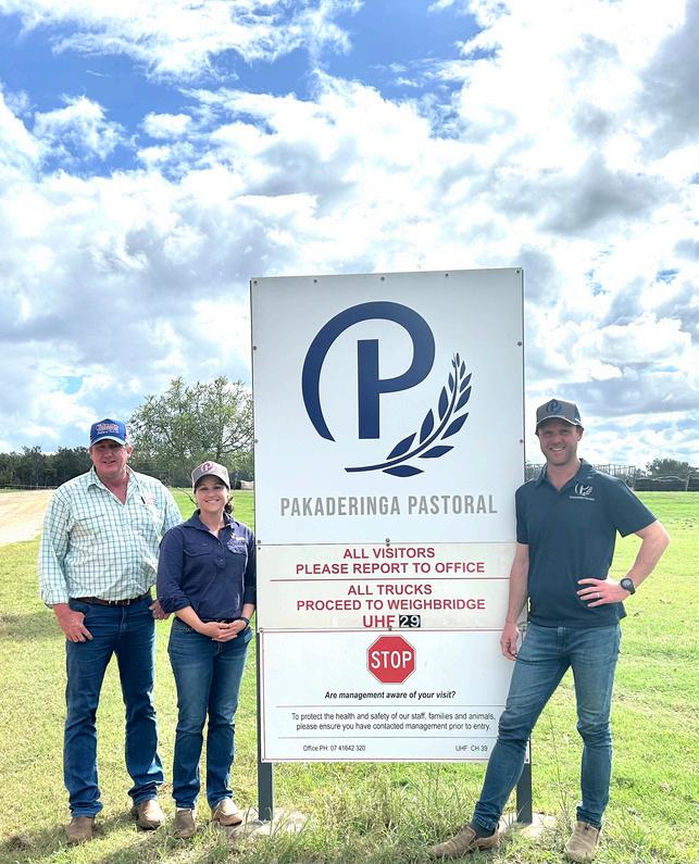 SantaGertrudisfielddirectorRussellYeates (left)welcomesBlackBoxCochiefoperating officerEmmaBlackwithPakaderingaFeedlot ownerLachieBrownattheKingaroyfacility.