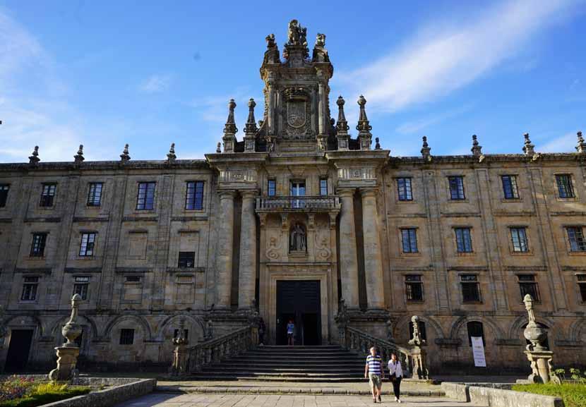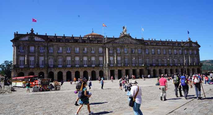 praza de obradoiro surrounding this grand cathedral, an elegant and expansive square that has been receiving pilgrims since the 12th century. The hostal de los reyes Católicos, which was constructed in 1501 and used as a pilgrim hospital, is now a parador, or government-owned luxury hotel stand next to the square and palacio de raxio, or the City Council Administration, which sits directly across the plaza from the cathedral. The center of praza do obradoiro is considered to be “kilometer zero” of every Camino de Santiago route.