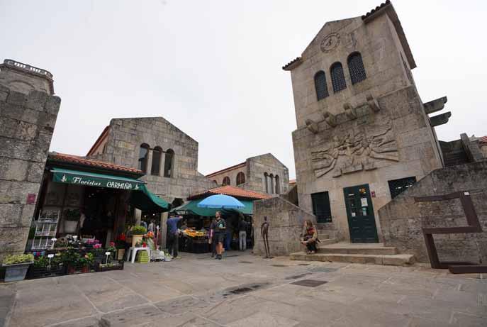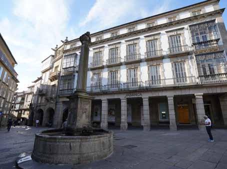 praza das praterías, or known as Silversmith’s Square, is named after the silver workshops of the middle ages. Praza das Praterías architectural features include a clock tower, the 19thcentury Fuente de los Caballos, or Fountain of the horses, and the northern façade of the cathedral. This romanesque façade, known as the puerta del paraíso, is highly ornate with several friezes of angels, apostles and symbols of the zodiac.