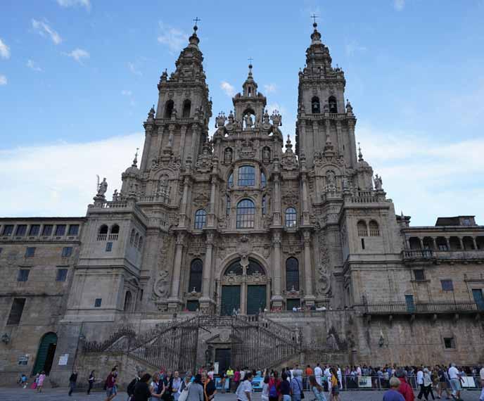 place of the Apostle Saint James. The structure was destroyed by invading moors in the year 997, but had its grandeur restored and now stands as one of Europe's finest romanesquestyle buildings. The western façade, or the obradoiro façade, reveals 243-foot tall (74 m) towers, large windows and a sizeable representation of St. James dressed in pilgrim attire. inside is the iconic 12th century pórtico de la Gloria. The portico has three arches for each nave of the church. its central arch has a figure of St. James. its jambs (columns) have elaborate depictions; the left-hand side has prophets, with the most notable being Daniel; and the right-hand side features the apostles peter, paul and John. inside, visitors can tour the high altar and four of the 16 chapels. To see more of the cathedral including its gothic cloisters, visitors must pay an admission fee to enter the Cathedral museum that will covers access to various other sections of the cathedral including the crypt of the pórtico de la Gloria, the Chapel of relics and Treasury, Sacred Art Exhibit and gothic cloisters. Visitors who pay the fee will also gain access to a balcony overlooking praza do obradoiro. Finally, visitors can visit the shrine of the Apostle St. James.
