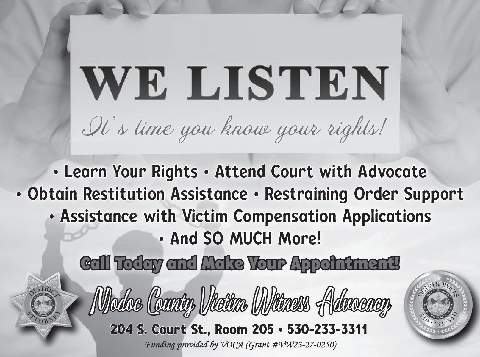Mass Victimization Advocate I. Lassen County. Salary: $20.54$27.05 Hourly, plus benefits. Filing deadline: Open until filled. First Review August 30, 2024. Duties: The Mass Advocate will coordinate community response to mass criminalization victimization incidents; develop, organize and coordinate plans that support and enhance immediate response and recovery efforts for victim/witness services. Minimum requirements: Mass Victimization Advocate I-Training and Experience: One year of responsible social work or social services experience (volunteer experience is creditable on an hour for hour basis), and equivalent to an Associates of Arts Degree in Sociology, Psychology, Criminal Justice, or a related field, OR -Two years of responsible social work, or social services experience, and 30 semester or 45 quarter units of college level credit with an emphasis on Social Work, Sociology, Psychology, Criminal Justice, or a related field.