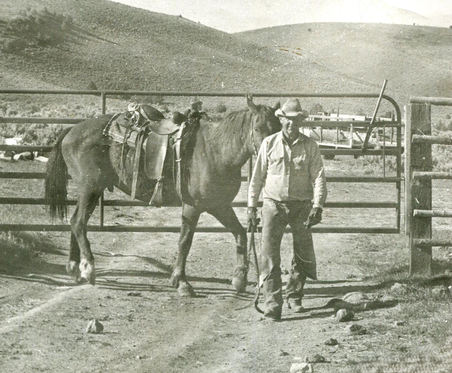 In 1947 Harry bought the Jim Barry ranch in Adel, Oregon, along with the Sagehen range located between Adel and Lakeview, Oregon. The Barry Ranch was essential to the Schadler operation as the winters could be severe in Cowhead, and more moderate to winter cattle in Adel. Harry and his son Lonny acquired the Coleman Valley ranch from Jack Nicol in 1973. It was part of the Cowhead Ranch in the original Ayers and Poor cattle operation. As the Ranch expanded, Harry spent much of his time buckarooing. He spent long days in the saddle overseeing spring turnout, fall gathering, and the general day-today cattle operations on the ranch and range. In later years, he spent days and nights with his son Lonny at his cattle camps at Sagehen and Big Valley as well as the group’s Barley Camp. Harry was always a good neighbor to fellow ranchers in Fort Bidwell and Adel. The Ranchers in both valleys helped each other brand calves, gathering both cattle and horses. Harry was skilled with a reata, so he brought more than his fair share of calves to the branding fire. As did other ranchers, Harry occasionally threw long loop team roping events in the local ranch rodeos. Jimmie Washoe, was one of his partners. The Schadler’s horse
