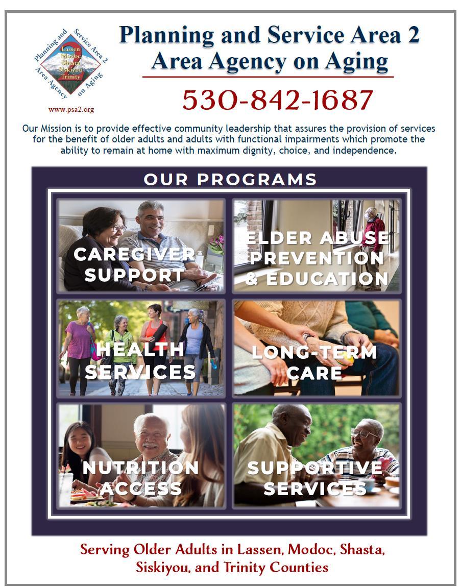 Please RSVP for the Public Hearing by contacting PSA 2 AAA at 530-842-1687 or programcoordinator@psa2.org by March 21, 2025, for meeting access information. 208 W Center St., PO Box 1400 • Yreka, California 96097 Telephone 530-842-1687 • Fax 530-842-4804 Website: www.psa2.org