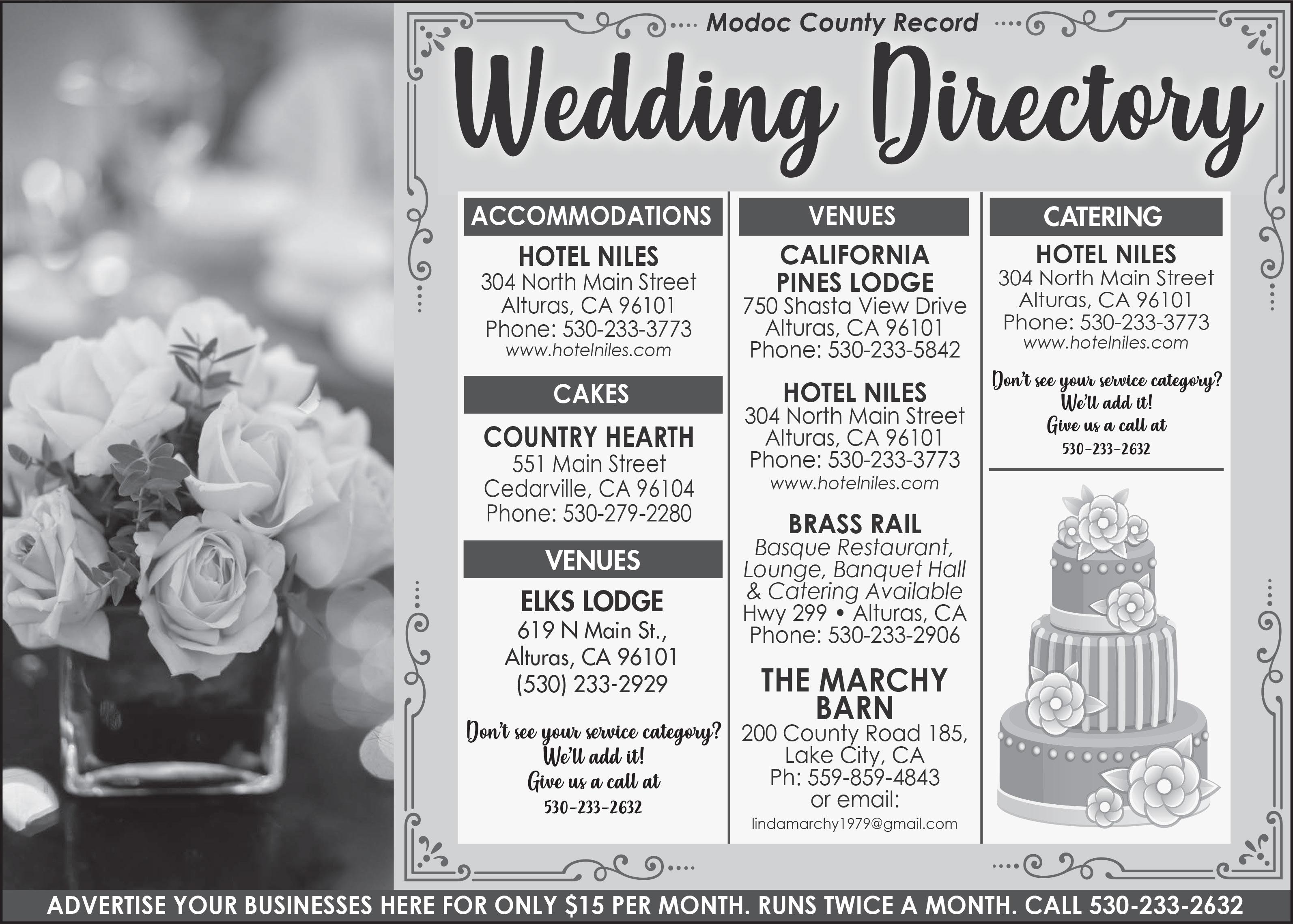 Deadline for Classified Advertising is Tuesdays at 10:00 a.m $10.00 $10.00 for each standard classified ad up to 35 words. PAYABLE IN ADVANCE. Standard ad is first two lines bold. Classifieds also appear on our website • CALL (530) 233-2632 • EMAIL: alisha@modocrecord.com