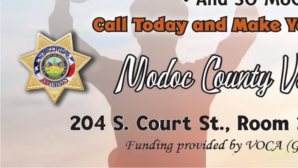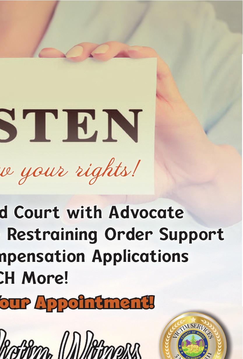 clerical tasks, transporting/ accompanying adults or children to and from activities or appointments, and other support for social service programs. Valid driver’s license required. Applications are available at Social Services, 120 N. Main St, Alturas, CA, or upon request to dssadmin@ co.modoc.ca.us. EOE/ADA/ Drug Free Workplace. (Jan8/ TFN)