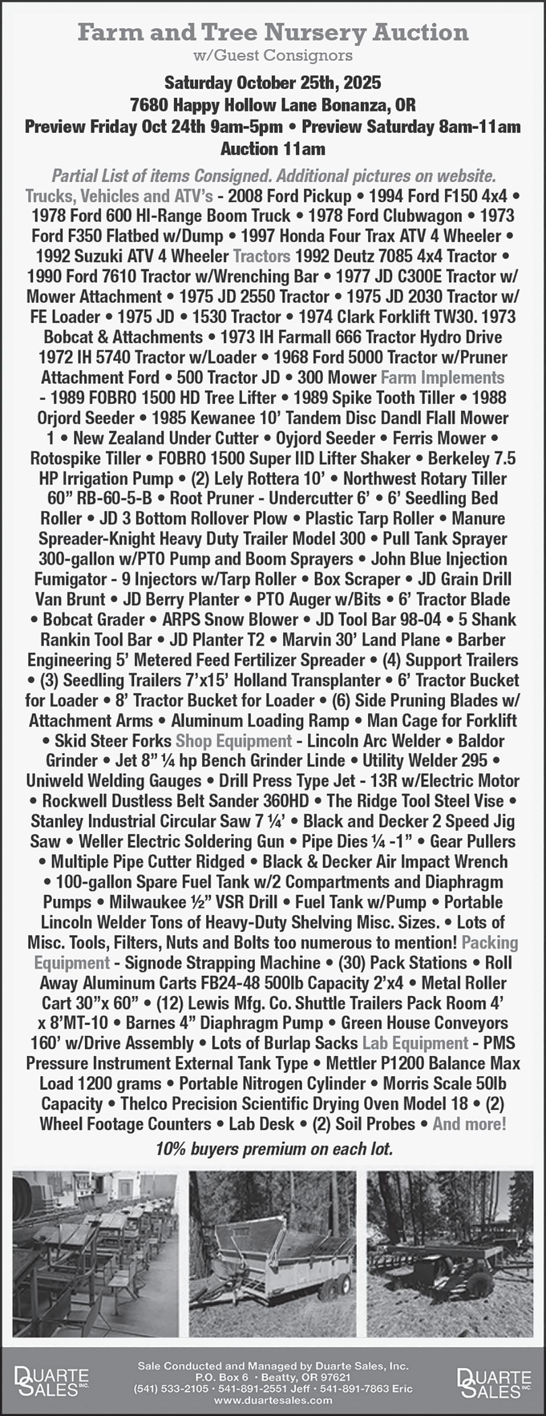 Yard Sale - at 320 Gooseloop - EVERYTHING MUST GO! in the Modoc Recreational Estates, Alturas. Fri., Oct. 24, 9 a.m. – 4 p.m., Sat., Oct. 25 - 9a.m. to 3 p.m. The Sale is in the Shop in the Back Yard! Baby clothes, baby shoes, antique furniture, vases, porcelain dolls, Barbie dolls. No Reasonable offer refused. Something for everyone! Questions call 1-831-5886829. (Oct23)