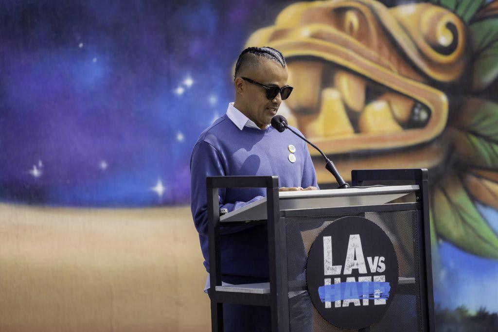 Frankie Aguirre, a survivor of hate, shared his experience with anti-gay harassment, explaining how LA vs Hate’s resources helped him move to a safer environment. Aguirre urged others to seek support through LAvsHate.org or by calling the 211 hotline.