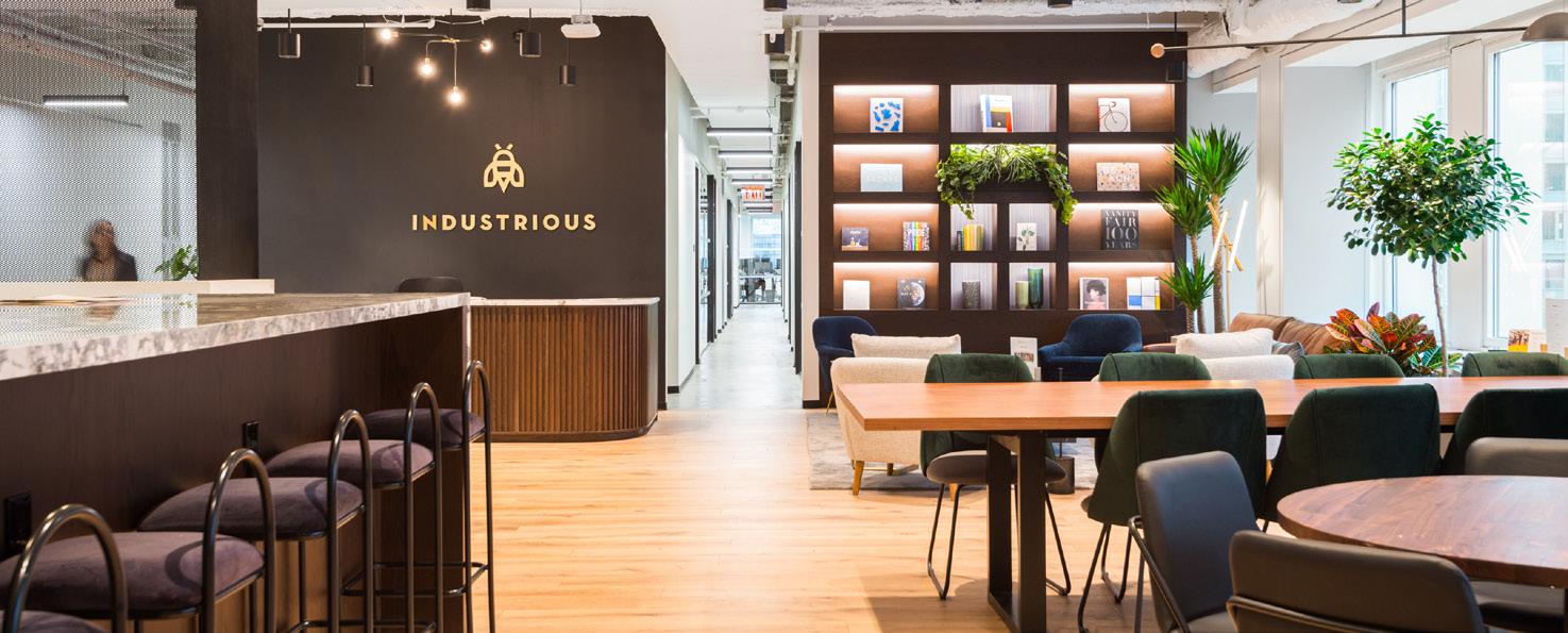 At Industrious workspaces, common areas such as cafes, meeting rooms, lounges and wellness rooms are shared. Offices come fully furnished and move in-ready while suites, or upgraded offices, come with a dedicated reception area and conference rooms.