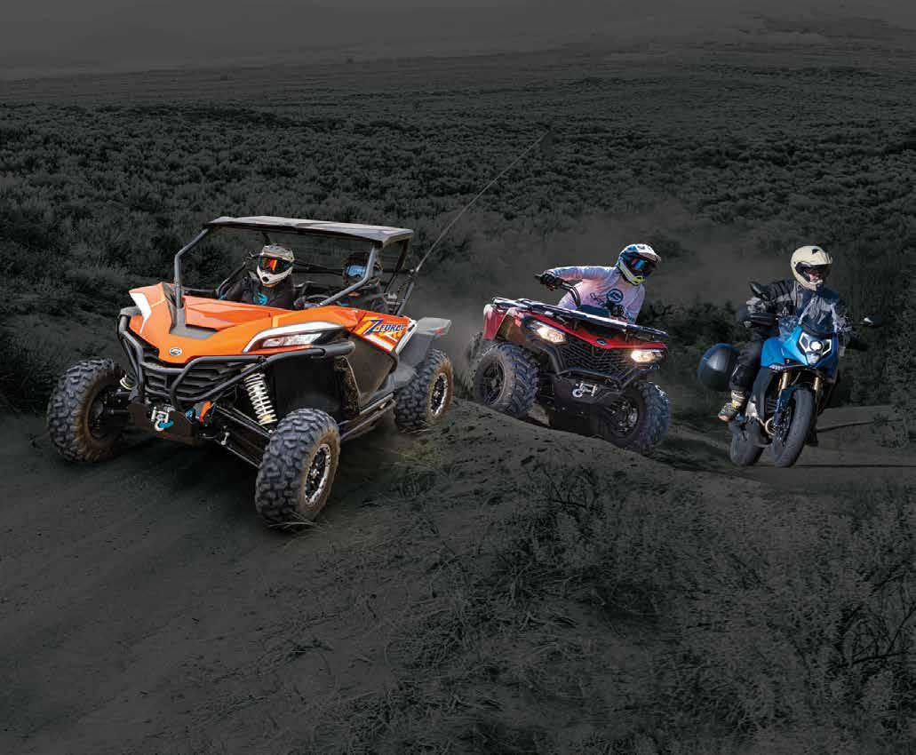 CFMOTO recreational vehicles and motorcycles can be hazardous to operate. Always read the Owner’s Manual and review vehicle warning labels before operation. Inspect your CFMOTO vehicle before riding. Operators and passengers must wear protective gear and use seat belts, cab netting, and doors (if equipped). Check state and local laws before operating on trails. For motorcycles, dress properly, avoid