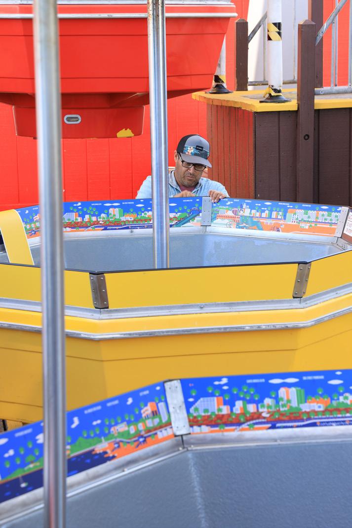 Daniel Báez made multiple drafts of the drawings and visited Pacific Park several times. Each time, the design team would print out the drafts, ride the Pacific Wheel, and discuss changes that could be made to enhance guests’ experience. Once the images were completed, large-format print specialists Verve Printing transferred them to durable ‘wraps’ and installed them inside the rim of the gondolas.