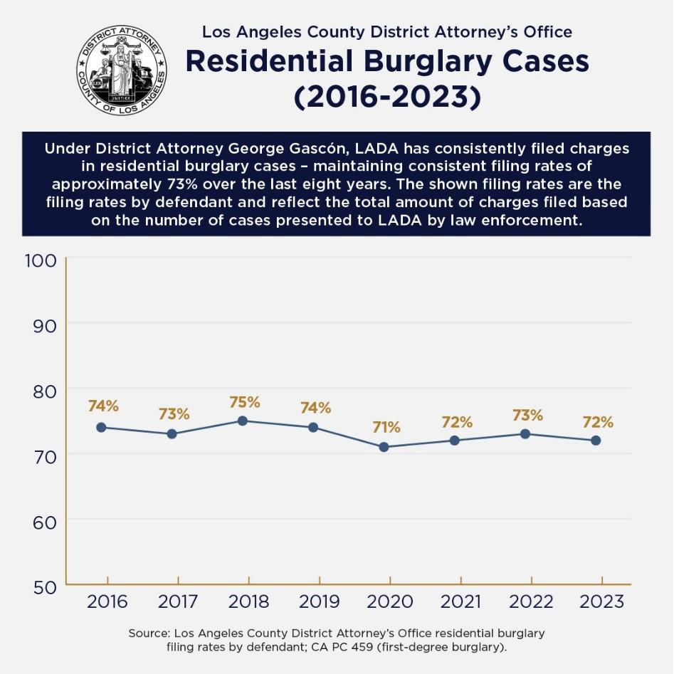 Gascón noted that residential burglaries are more than just property crimes; they violate the sanctity of homes, instill fear, and can have lasting psychological effects on victims. The District Attorney’s Office has consistently maintained a high rate of charge filings in these cases, with approximately 73% of residential burglary cases presented by law enforcement resulting in charges over the past eight years.