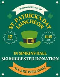 Women of Action, a circle of United Women in Faith (formerly United Methodist Women), in partnership with Fellowship and Events and Children’s Ministry, ALL ARE WELCOME to the 21st Annual St. Patrick’s Day Luncheon on March 12, at 11:15 a.m. in Simkins Hall. The suggested donation of $10 per person includes lunch and a rousing singalong with virtuoso piano accompaniment. Children are welcome and will be provided seasonal crafting materials. Children under 5 will be admitted for free. Tickets will be available on Sunday March 5, and on the day of the event. Don’t forget to wear green!