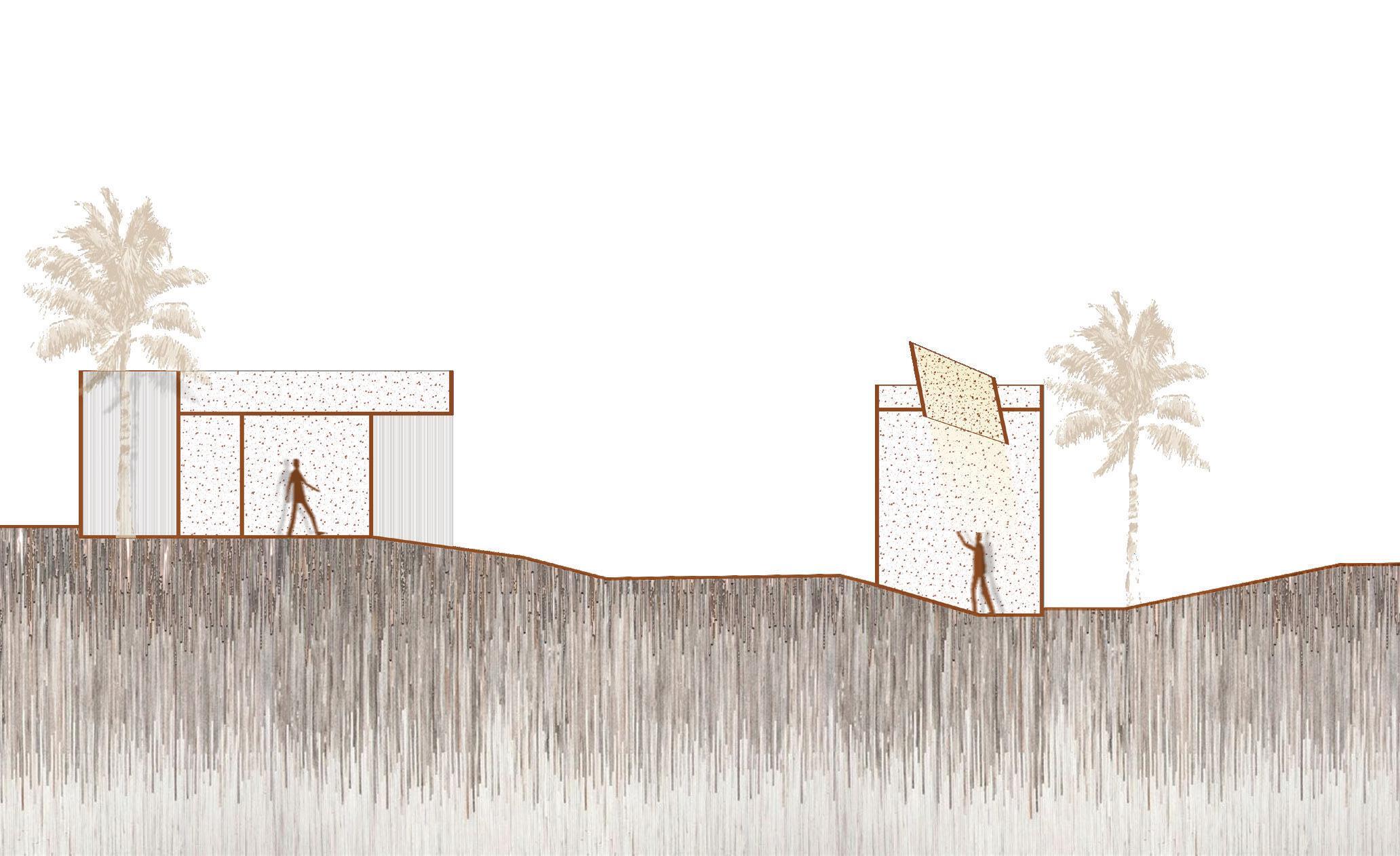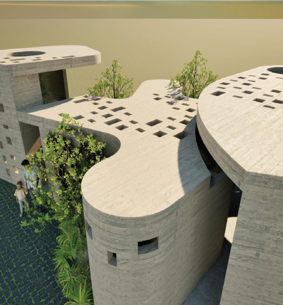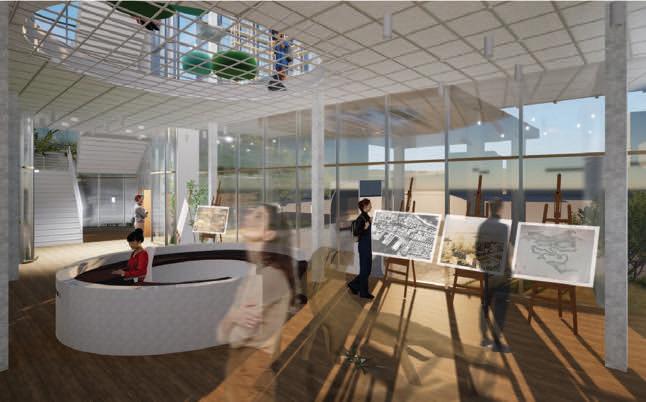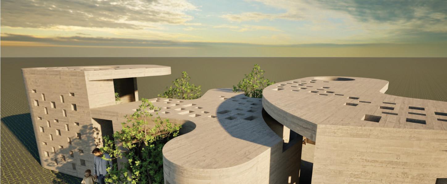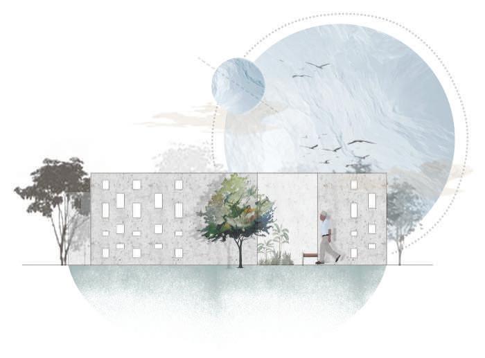 areas in the middle, and private administrative functions in the rear. A node-like main staircase at the front connects all levels and provides views of the redesigned plaza, which features reforested areas for enhanced environment, ventilation, and shade. The facade's screen evokes the memory of the original mangrove ecosystem, serving as a metaphorical bridge between past and present. This design creates a modern and inviting space for learning and community engagement while paying homage to the area's rich and complex historical landscape.