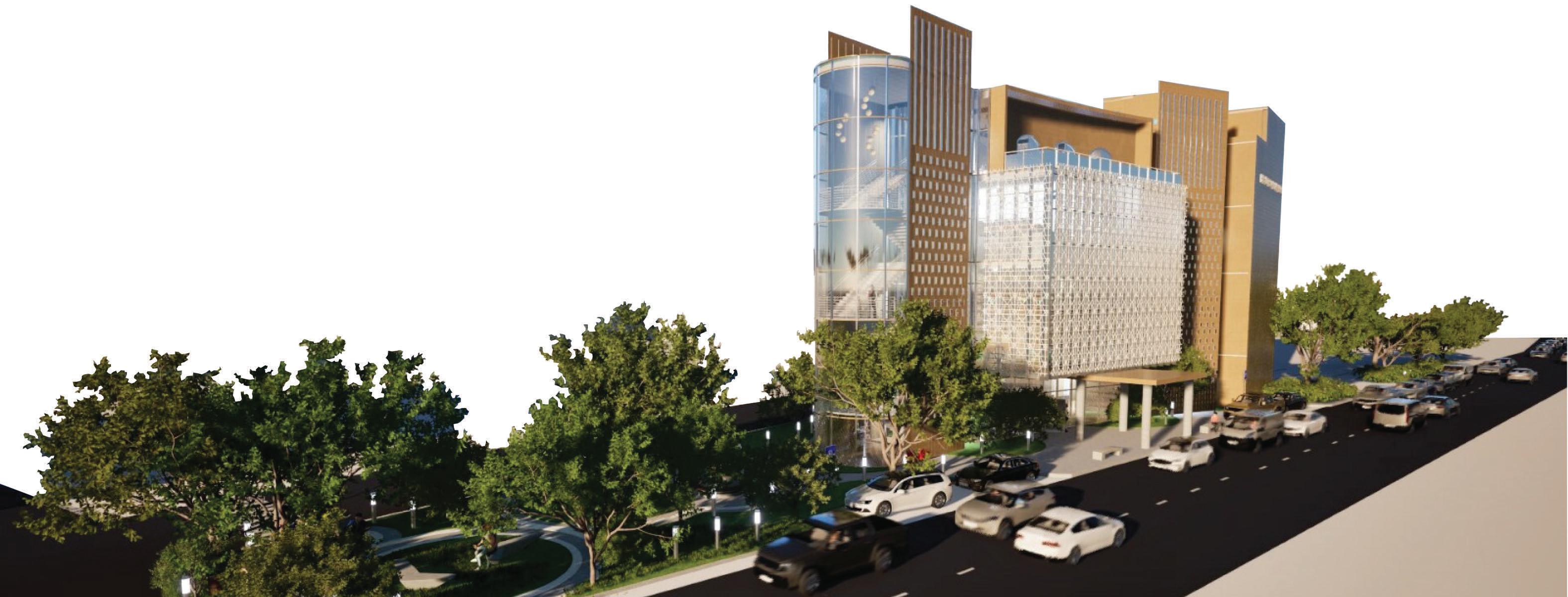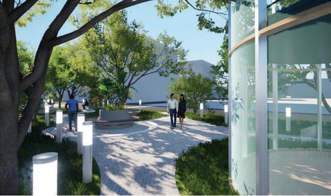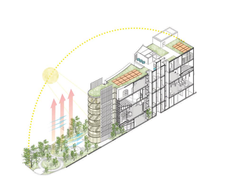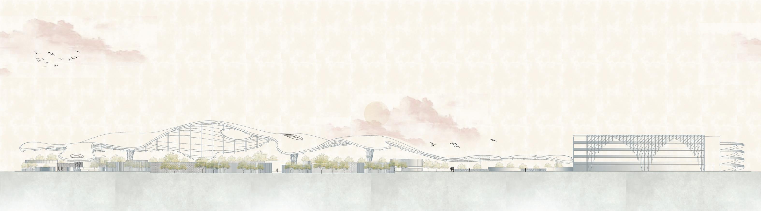 areas in the middle, and private administrative functions in the rear. A node-like main staircase at the front connects all levels and provides views of the redesigned plaza, which features reforested areas for enhanced environment, ventilation, and shade. The facade's screen evokes the memory of the original mangrove ecosystem, serving as a metaphorical bridge between past and present. This design creates a modern and inviting space for learning and community engagement while paying homage to the area's rich and complex historical landscape.