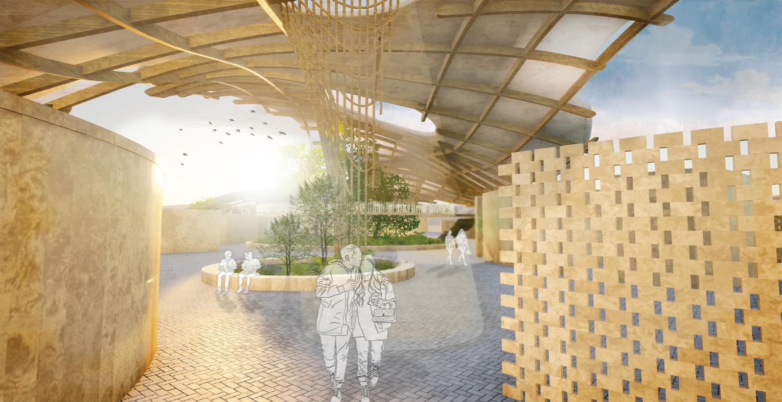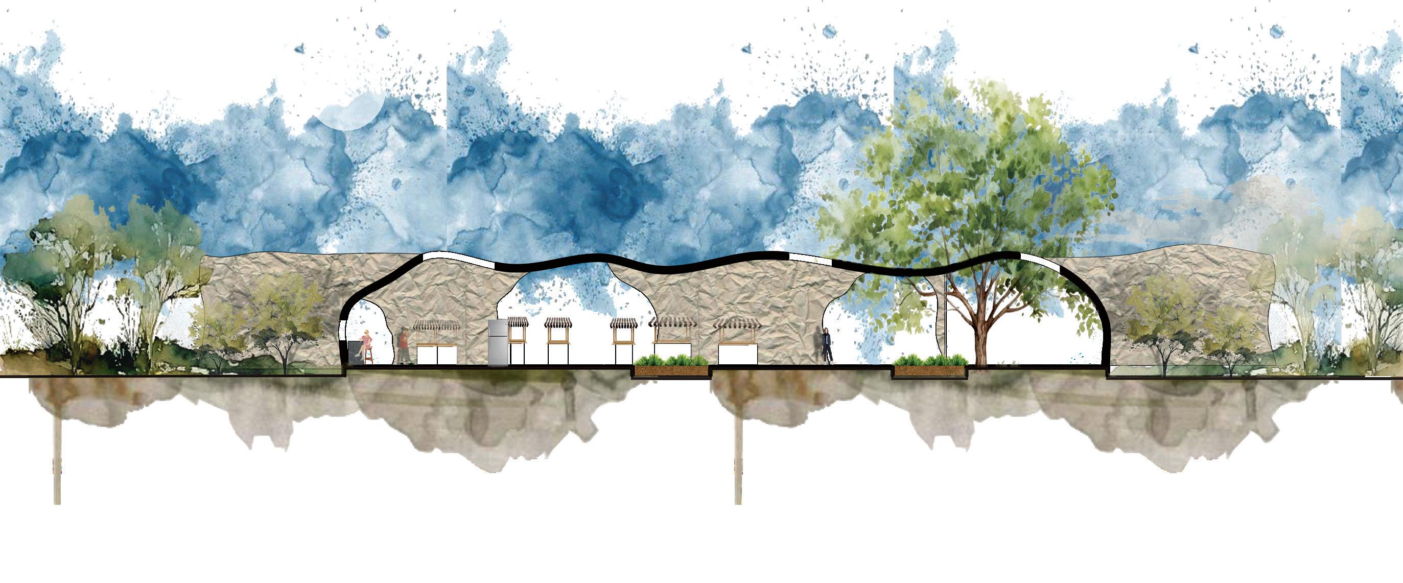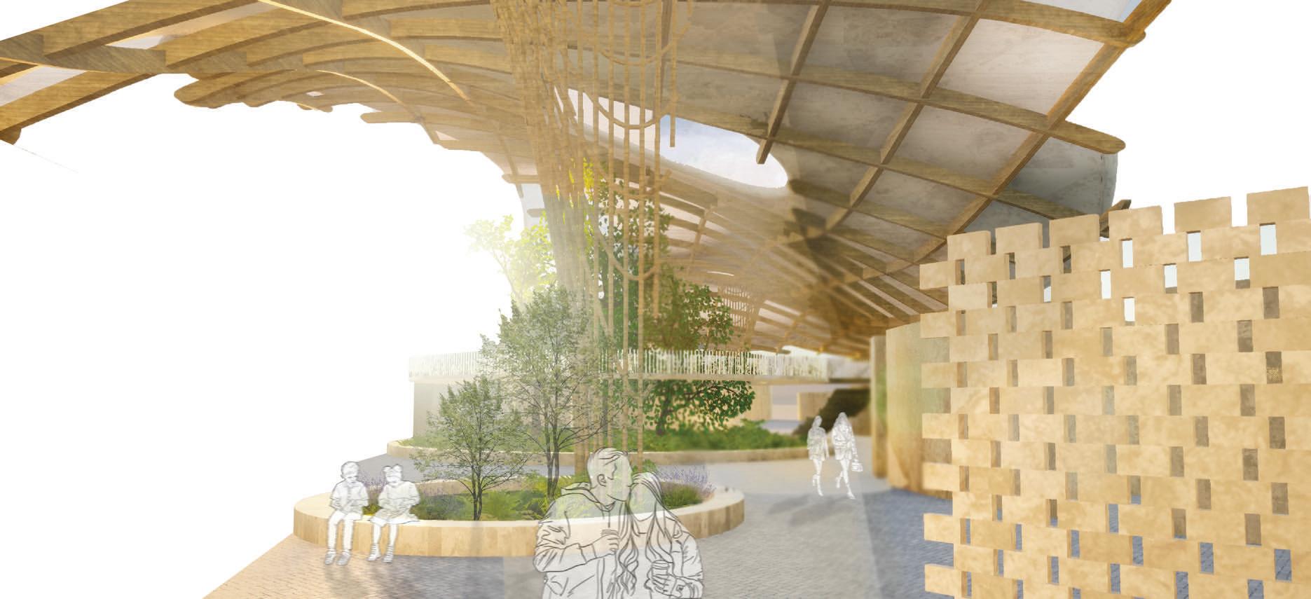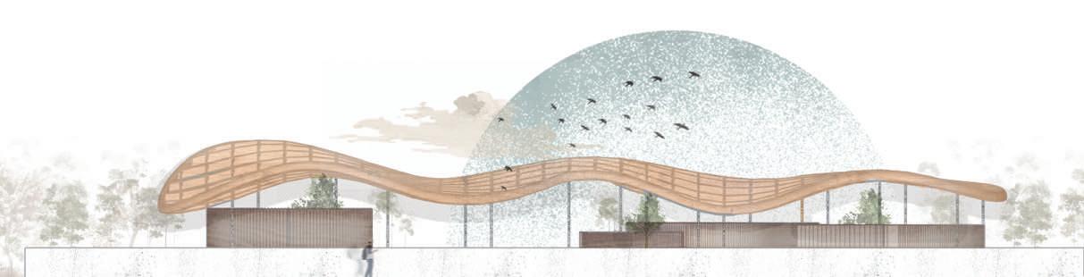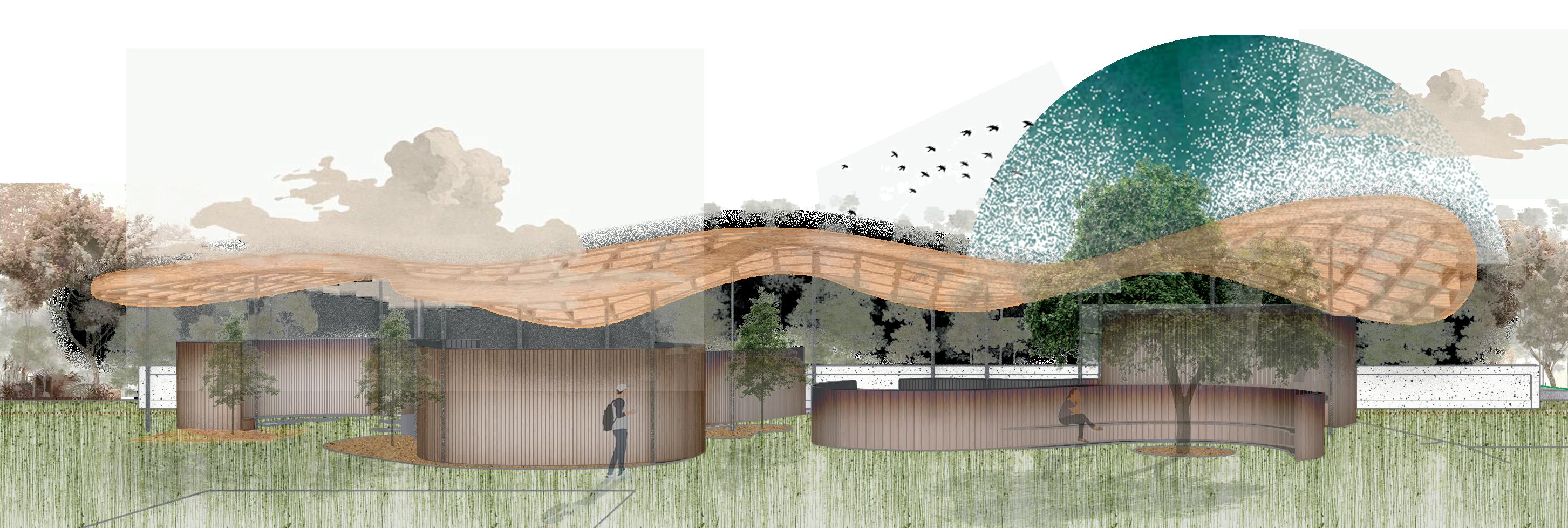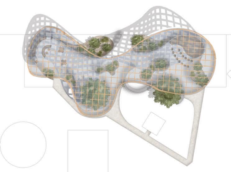 This project is inspired by the fluid motion of a wave, the design symbolizes the endless flow of imagination. Gardens strategically define the background and figure, creating diverse environments that allow students to choose spaces that resonate with their comfort and learning style. The architectural design emphasizes transparency through an innovative ceiling structure that generates a delicate lattice effect, ensuring optimal airflow and a sense of warmth. By integrating materials like wood, concrete, and metal, the space achieves a tranquil and inviting atmosphere that encourages exploration, contemplation, and interconnectedness with the built and natural environment.