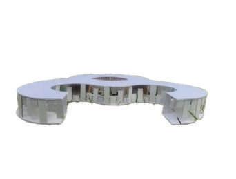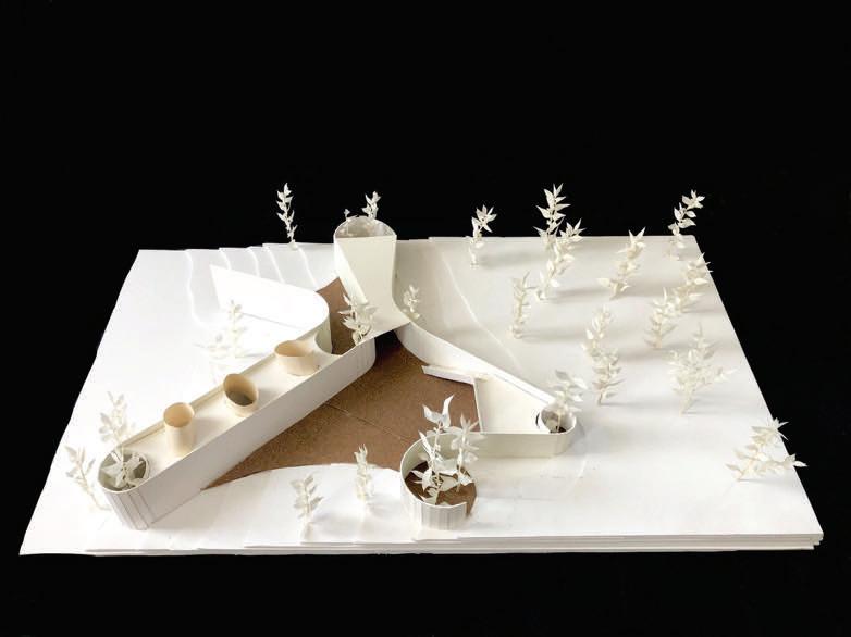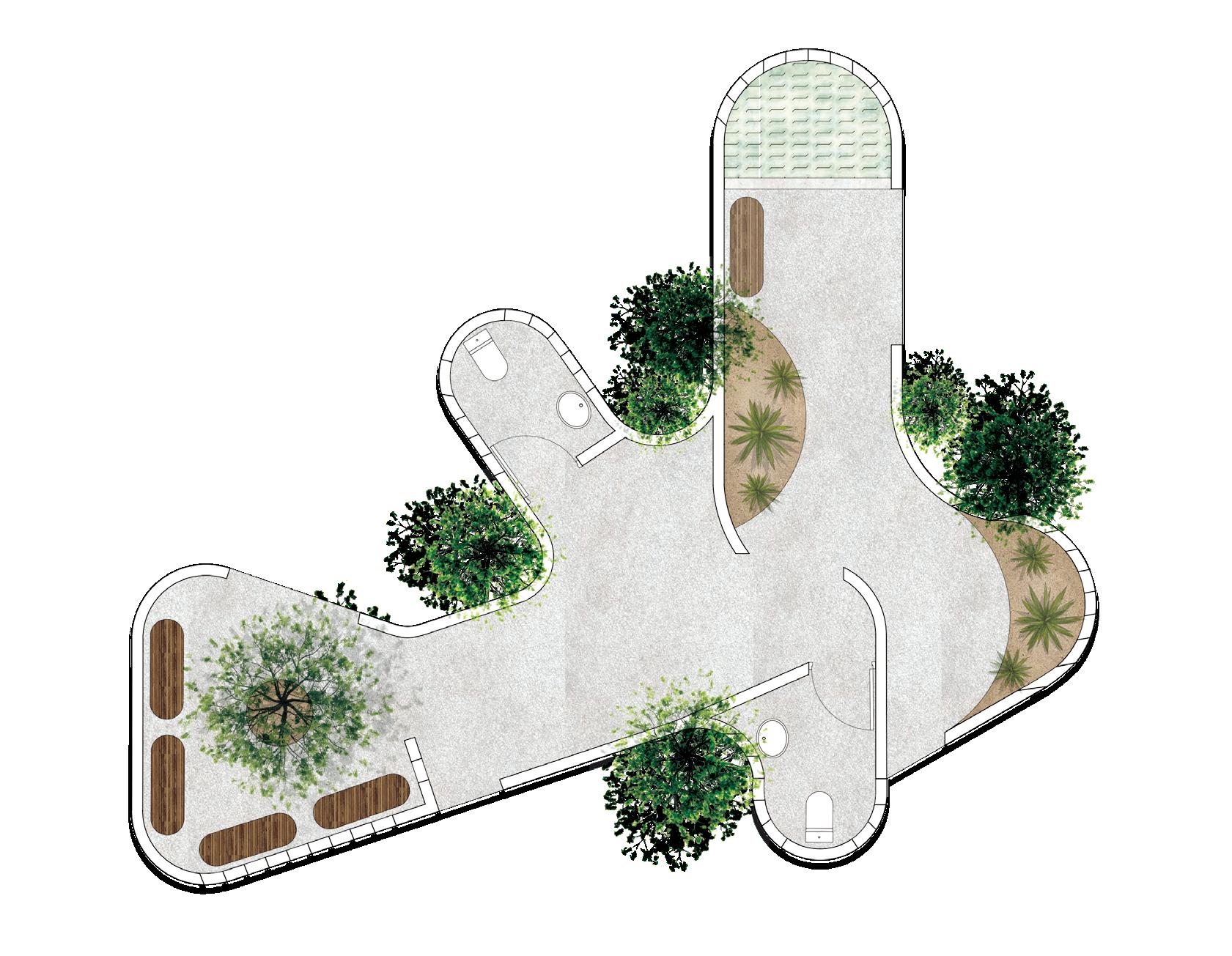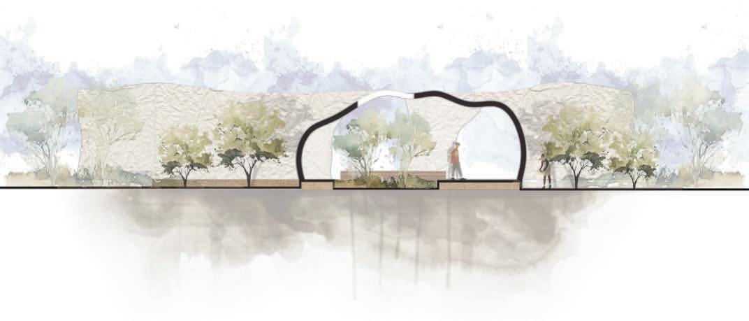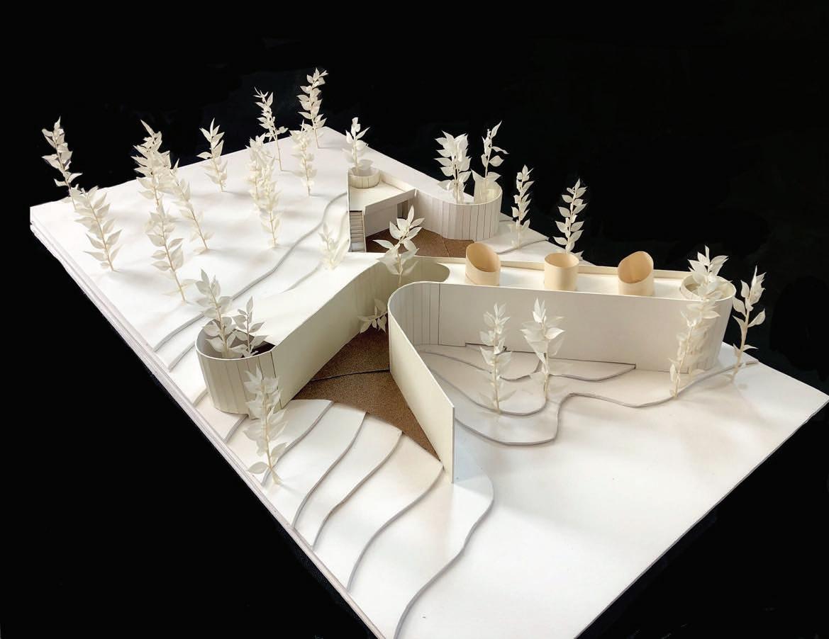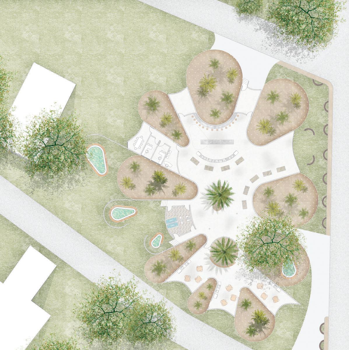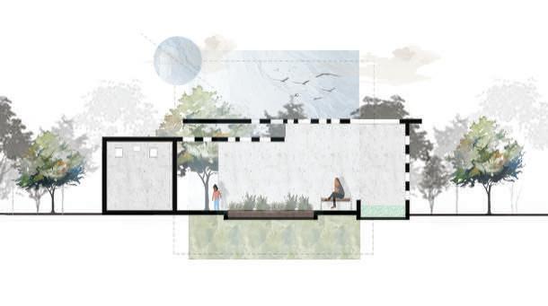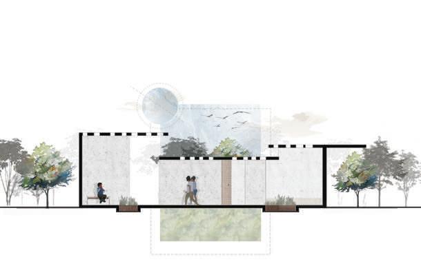 This pavilion features a circulation defined by an analysis of circles. The walls rise and fall with the terrain, while the circular paths and rooms create a fluid, dynamic space. It counts on areas that showcase interactions with natural light, including skylights that bathe the interior with a soft glow. This creates a harmonious environment that encourages exploration and engagement with the beauty of the botanical garden.