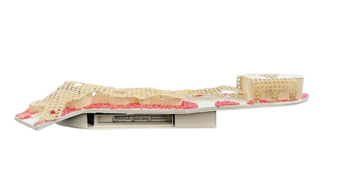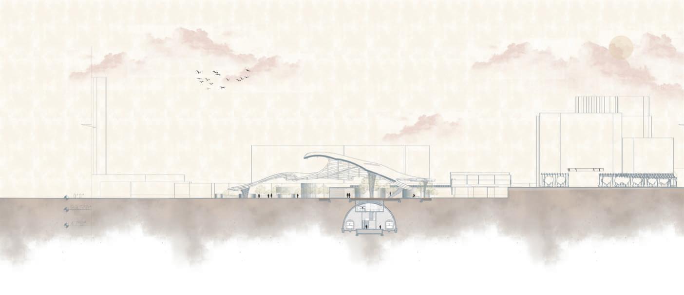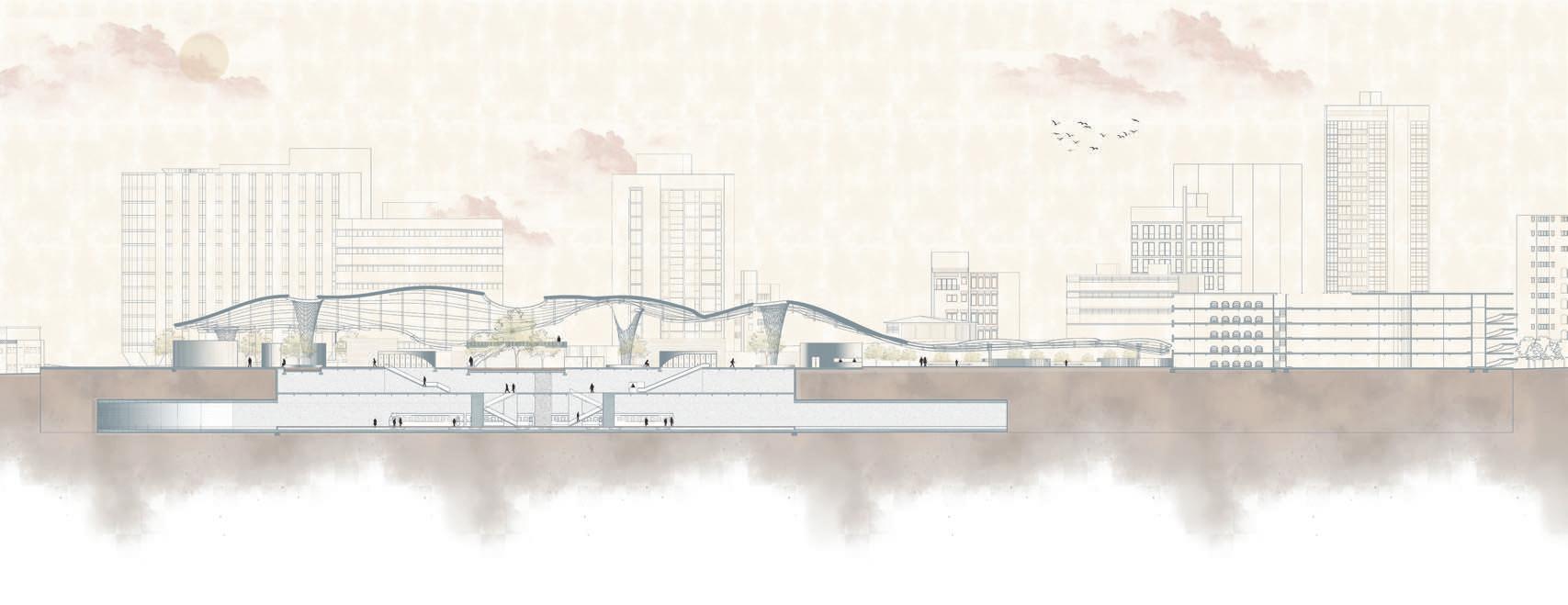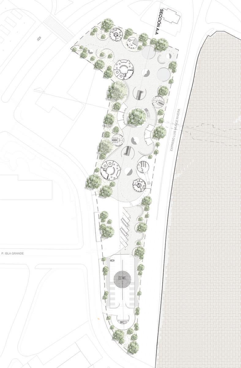 An extension of Puerto Rico's Urban Train to Miramar, was created serving as transportation and an entertainment hub. The design focuses on a roof that embraces the entire project. The train operates underground to minimize noise pollution. The design functions as both an interior and exterior space, with courtyards centered around columns that serve not only as structural elements but also provide seating areas for people to enjoy the environment.