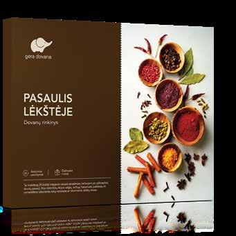 Rinkinį sudaro maždaug 25 būdai keliauti kitaip! Dovanos gavėjas rinksis šalį, kurios patiekalų norėtų paragauti, ir jo lėkštėje atsidurs vakarienės ar gardžių pietų ansamblis, per unikalius skonius bei aromatus subtiliai papasakosiantis apie kraštą, kurį pasirinko aplankyti savo skonio receptoriais.
