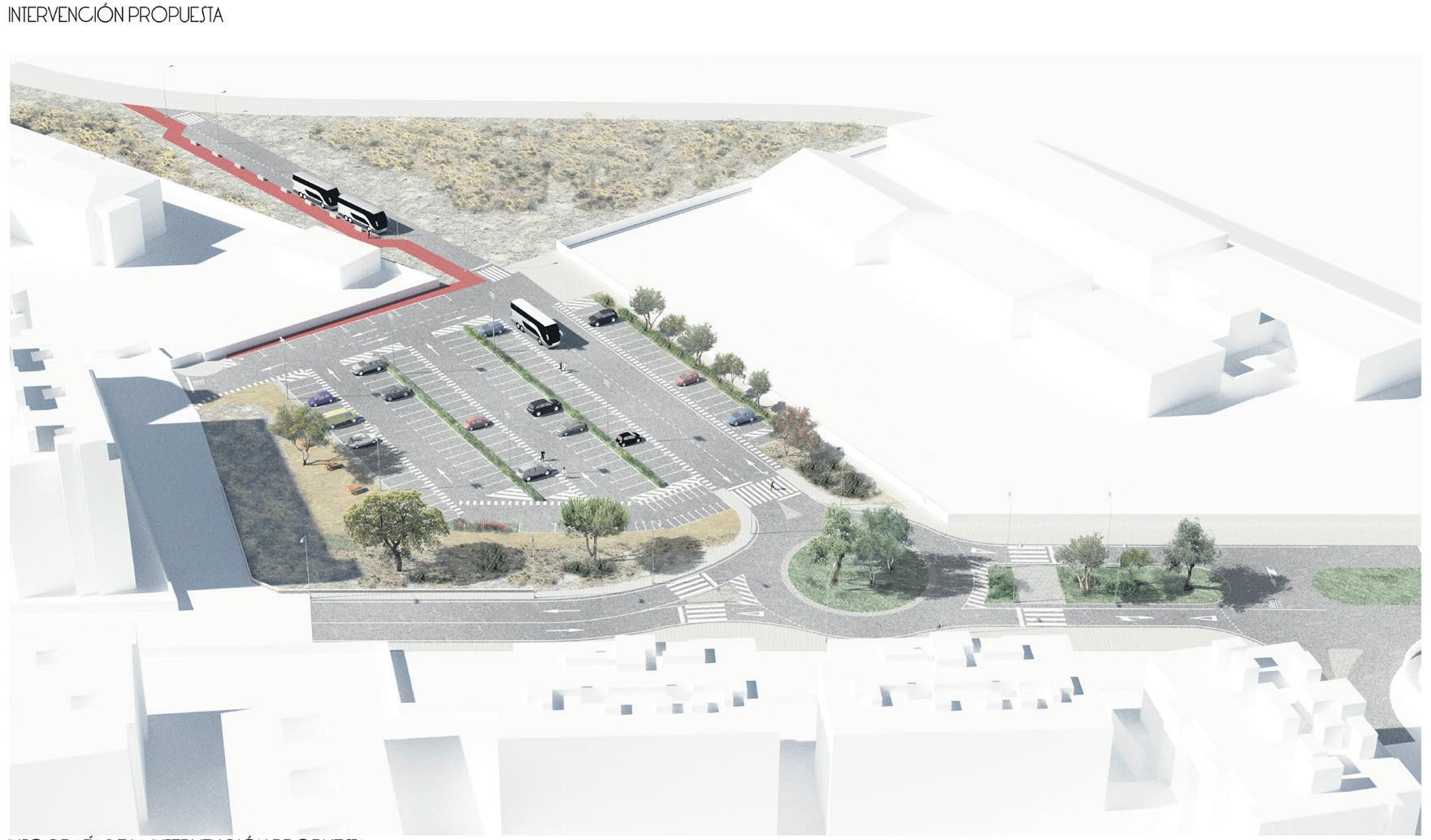 Aparcamientos, a los lados Se modificaría el acceso actual a la Lonja a través de una pequeña glorieta de 13 metros de radio, ubicada en la zona norte, entroncando con los distintos aparcamientos en batería existentes, que serían eliminados y colocados a ambos lados del nuevo vial, generando un itinerario rodado por el centro de la calle, habilitando un carril por sentido.