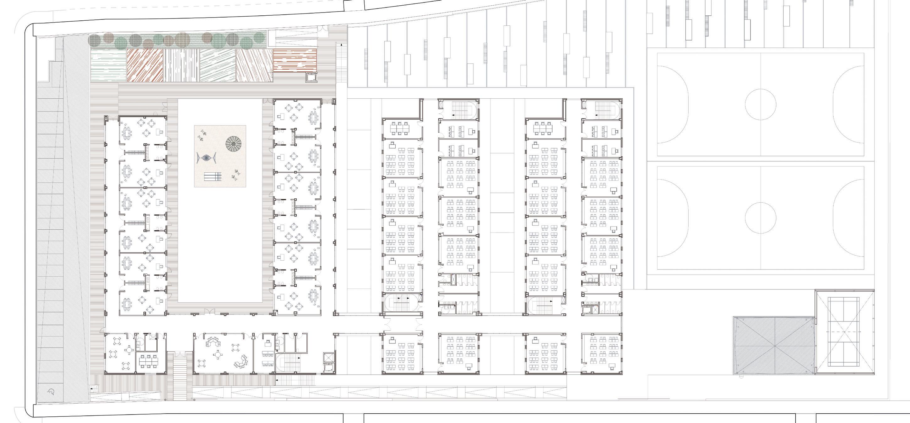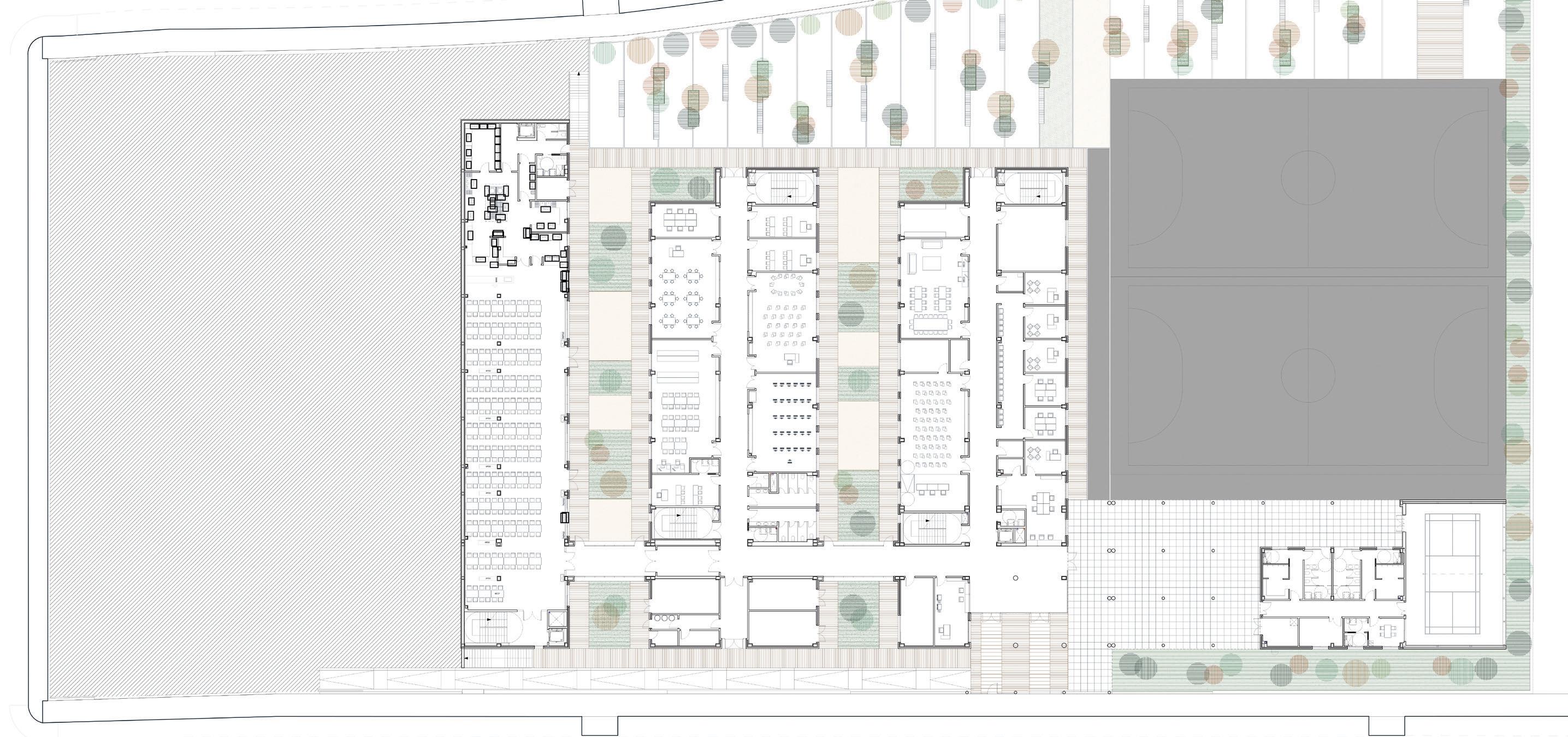 El edificio está planteado en peine para el máximo aprovechamiento de la parcela, generando una serie de espacios de gran calidad entre bloques que permiten una buena iluminación de las aulas, y por otro lado, un gran espacio libre continuo y que conecta las diferentes zonas al fondo de la parcela. Este espacio protegido respecto a los viales de mayor tamaño, está ocupado por el huerto, las pistas deportivas y los espacios de juegos y relación.