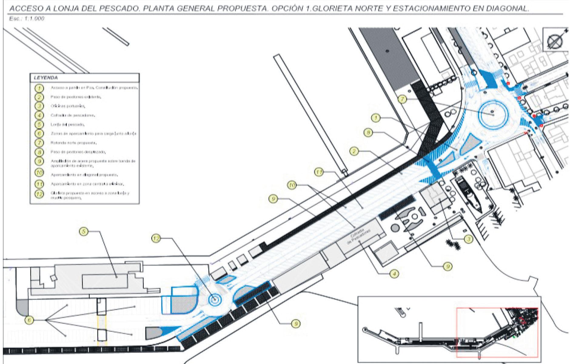 El objetivo es conseguir una clara mejora de la circulación interior, el aprovechamiento de las áreas anexas a la dársena, y la mejora funcional de los accesos de todo tipo de vehículos que vayan tanto a la Lonja como a la Cofradía y resto de dependencias del muelle. Conjuntamente se plantea la posibilidad y compatibilidad de reordenar el acceso actual a la