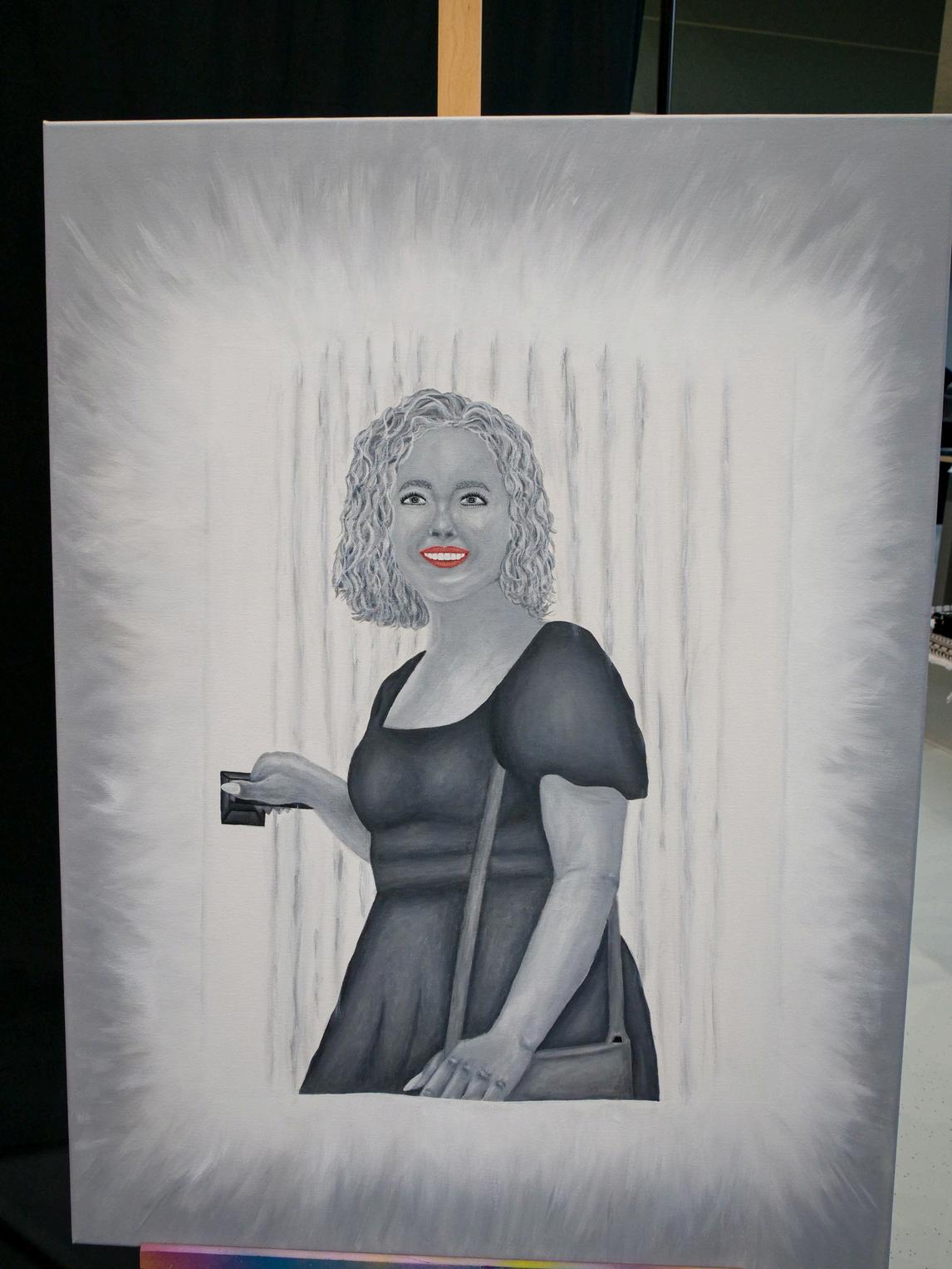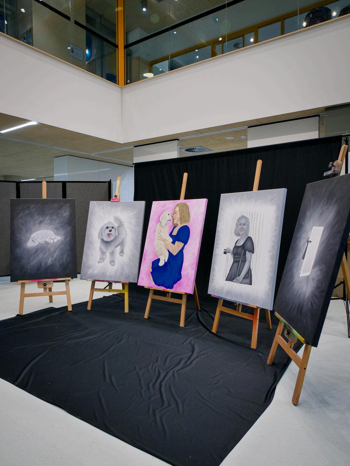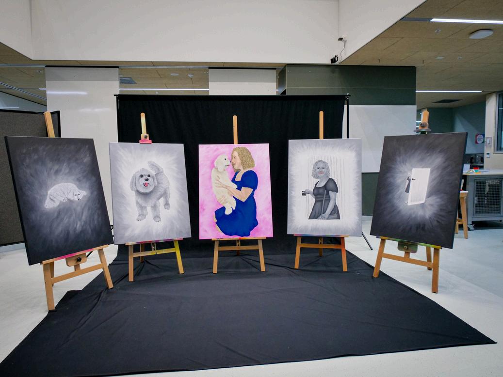 “Home is Where the Heart Is” explores the unique and profound bond between humans and their pets, a connection communicated not through words, but through shared emotion and presence. Inspired by my relationship with my dog, Bonnie, this body of work contrasts the pain of separation with the joy of reunion, capturing the emotional depth of this connection. Through painting and film, I sought to express the enduring comfort and emotional completeness that pets bring to our lives. My conceptual practice focuses on the unconditional nature of the human–animal relationship and its emotional significance. Using acrylic paint as my main material practice, I explored tone, scale, and composition across five canvases Works 1 and 5 feature small, central figures surrounded by dark backgrounds, symbolising isolation Artworks 2 and 4 depict the moment of reunion, where soft greys and white backgrounds, along with bursts of colour on the mouths, express returning joy Artwork 3 uses full colour and a filled frame to convey wholeness and shared love