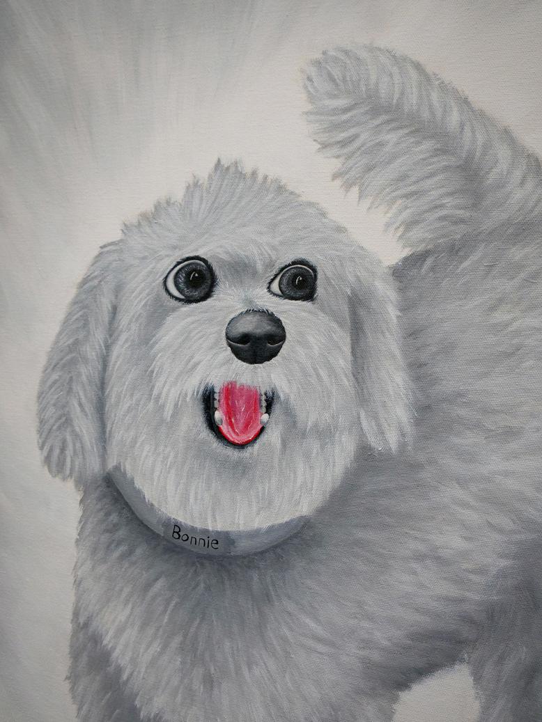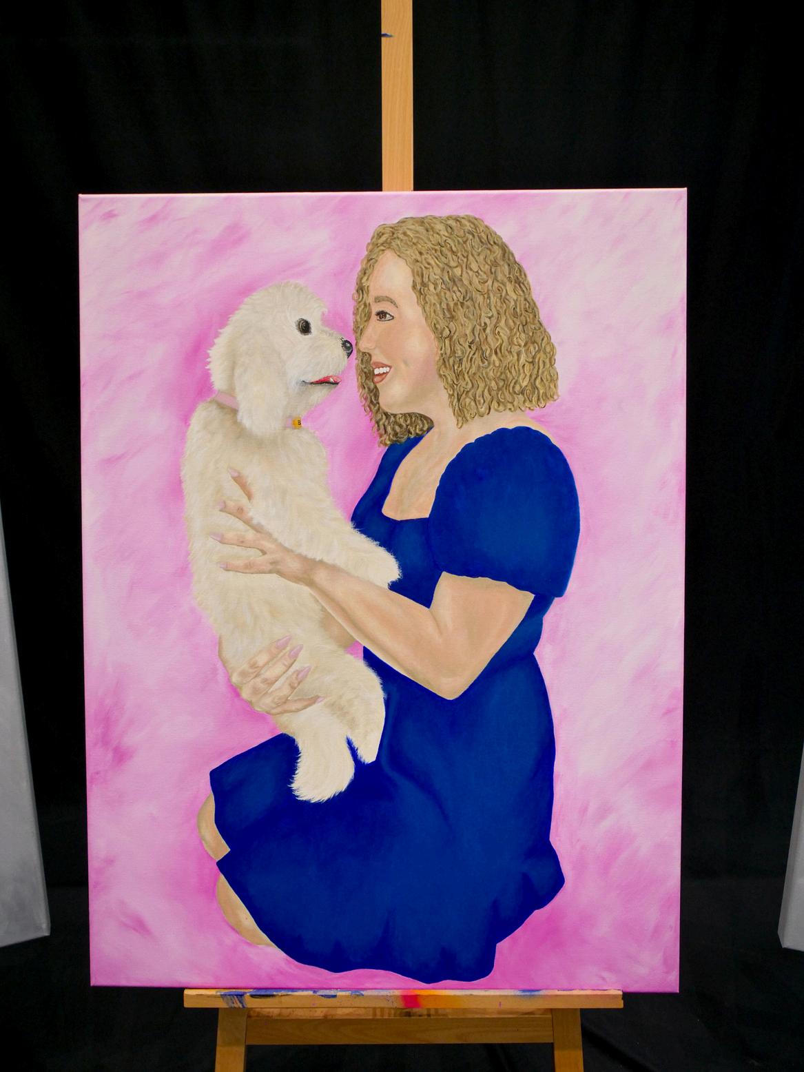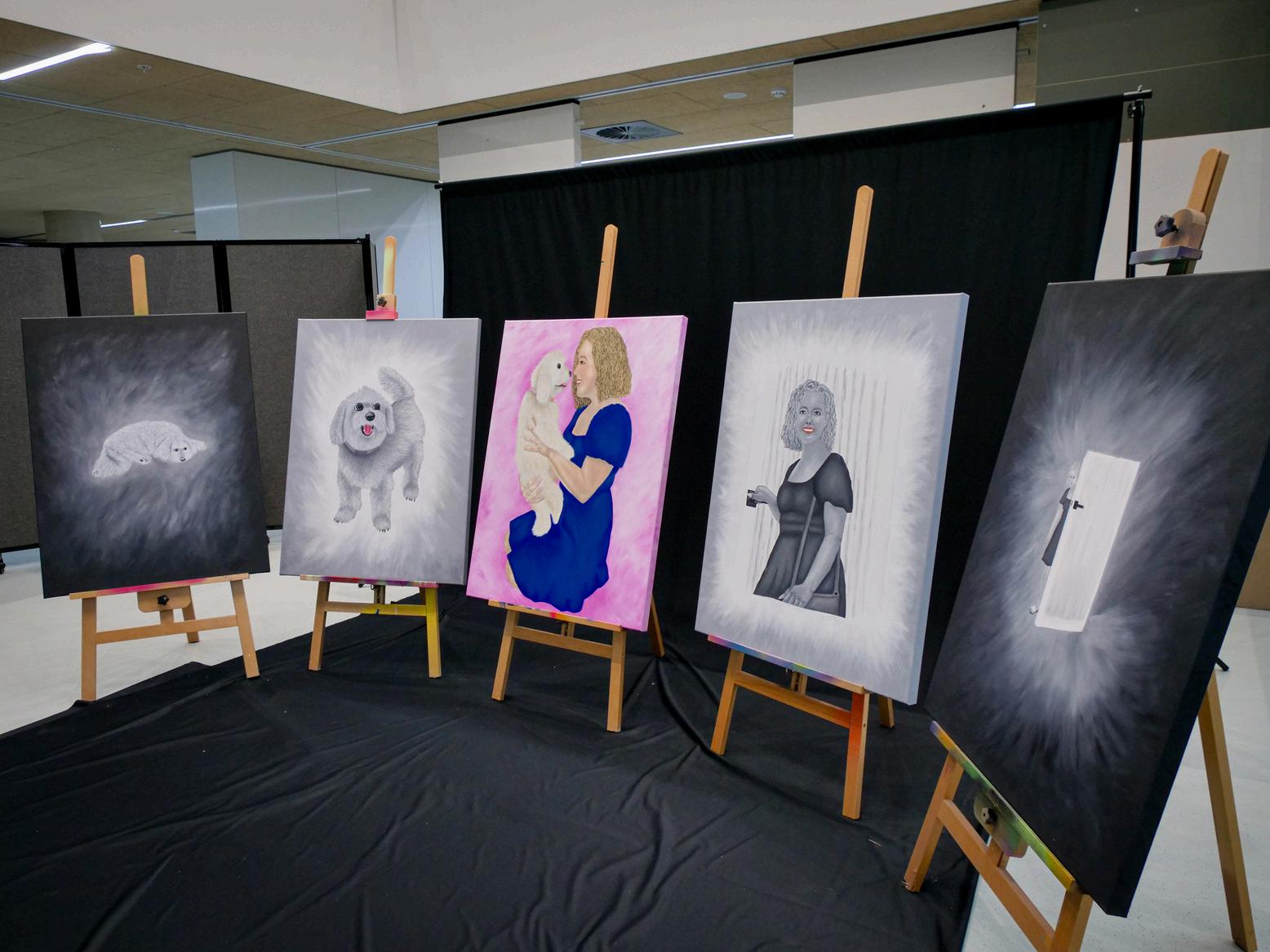 “Home is Where the Heart Is” explores the unique and profound bond between humans and their pets, a connection communicated not through words, but through shared emotion and presence. Inspired by my relationship with my dog, Bonnie, this body of work contrasts the pain of separation with the joy of reunion, capturing the emotional depth of this connection. Through painting and film, I sought to express the enduring comfort and emotional completeness that pets bring to our lives. My conceptual practice focuses on the unconditional nature of the human–animal relationship and its emotional significance. Using acrylic paint as my main material practice, I explored tone, scale, and composition across five canvases Works 1 and 5 feature small, central figures surrounded by dark backgrounds, symbolising isolation Artworks 2 and 4 depict the moment of reunion, where soft greys and white backgrounds, along with bursts of colour on the mouths, express returning joy Artwork 3 uses full colour and a filled frame to convey wholeness and shared love