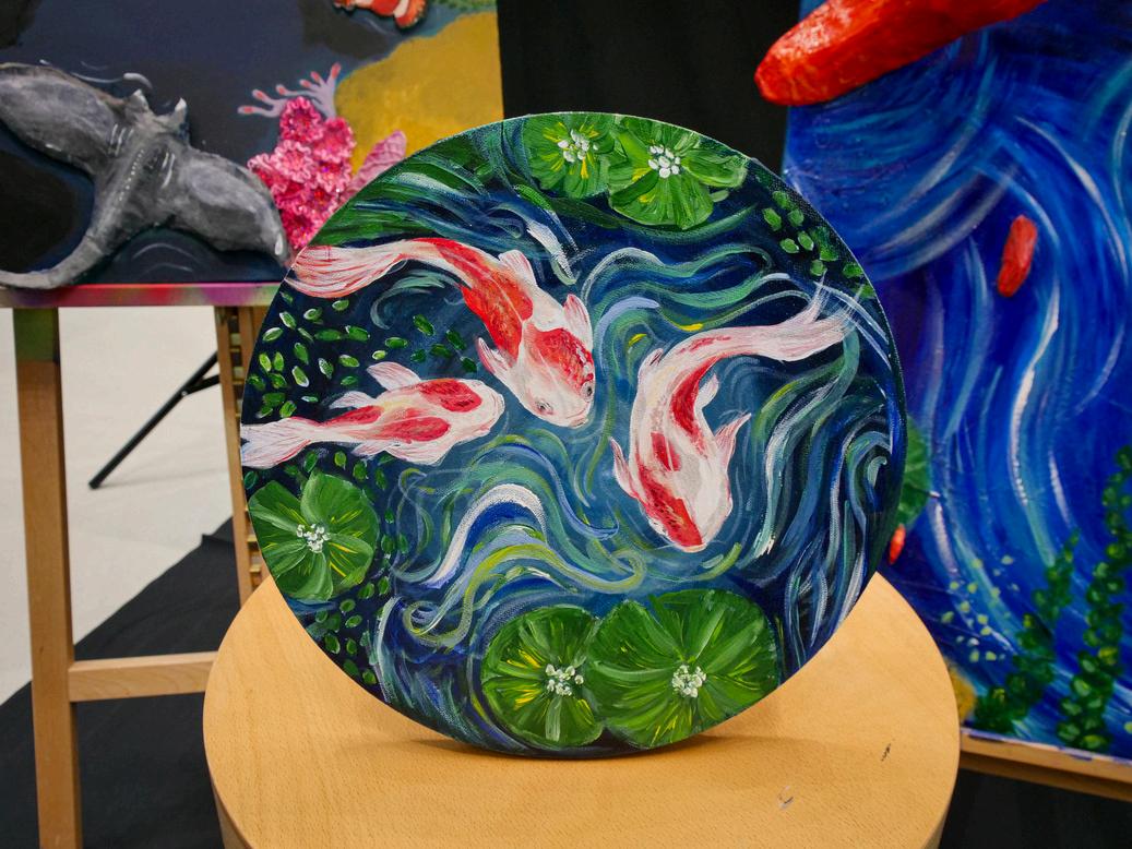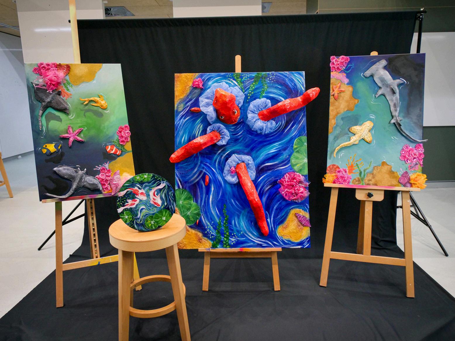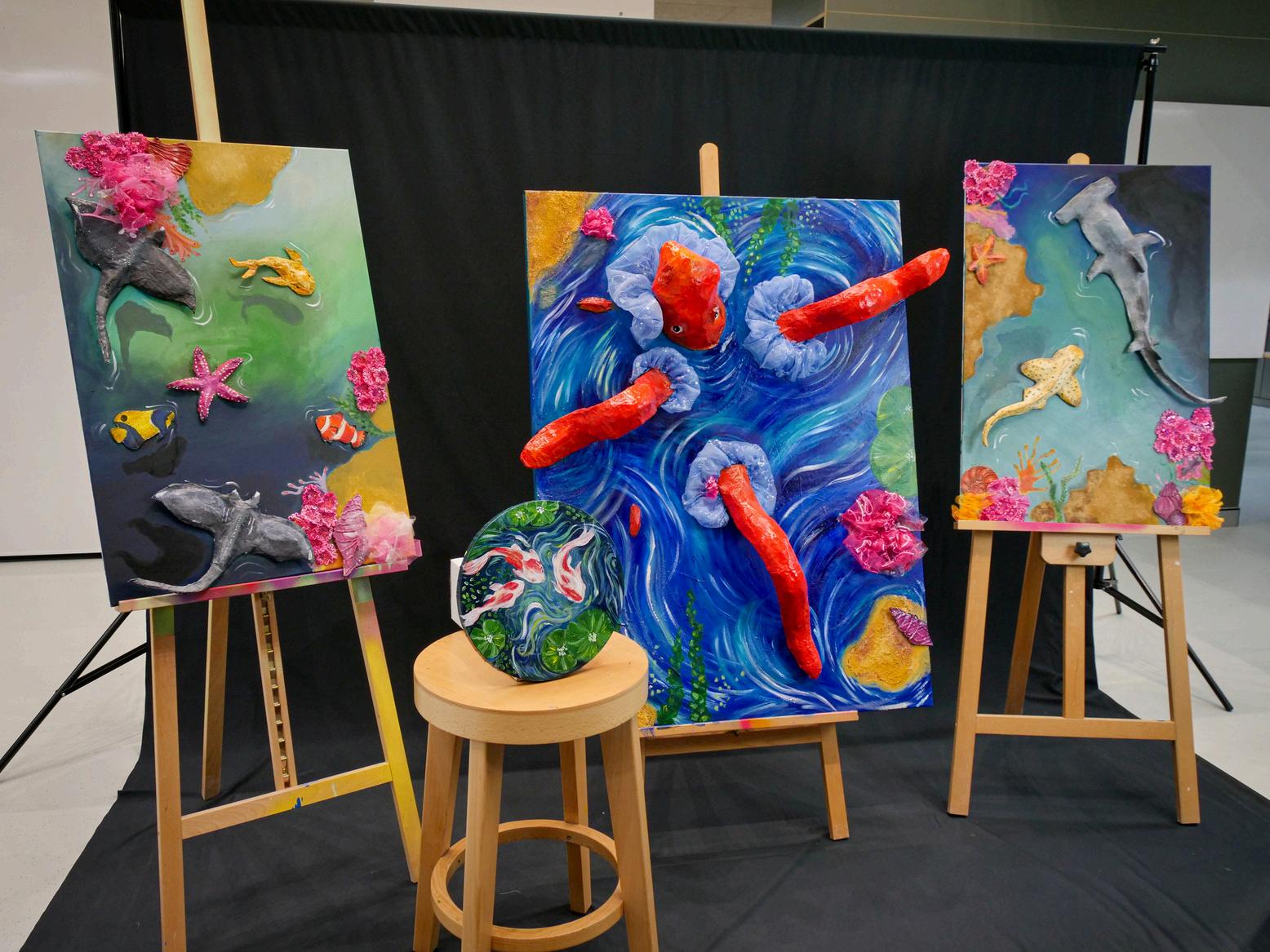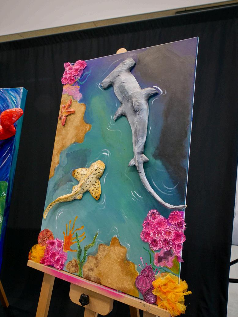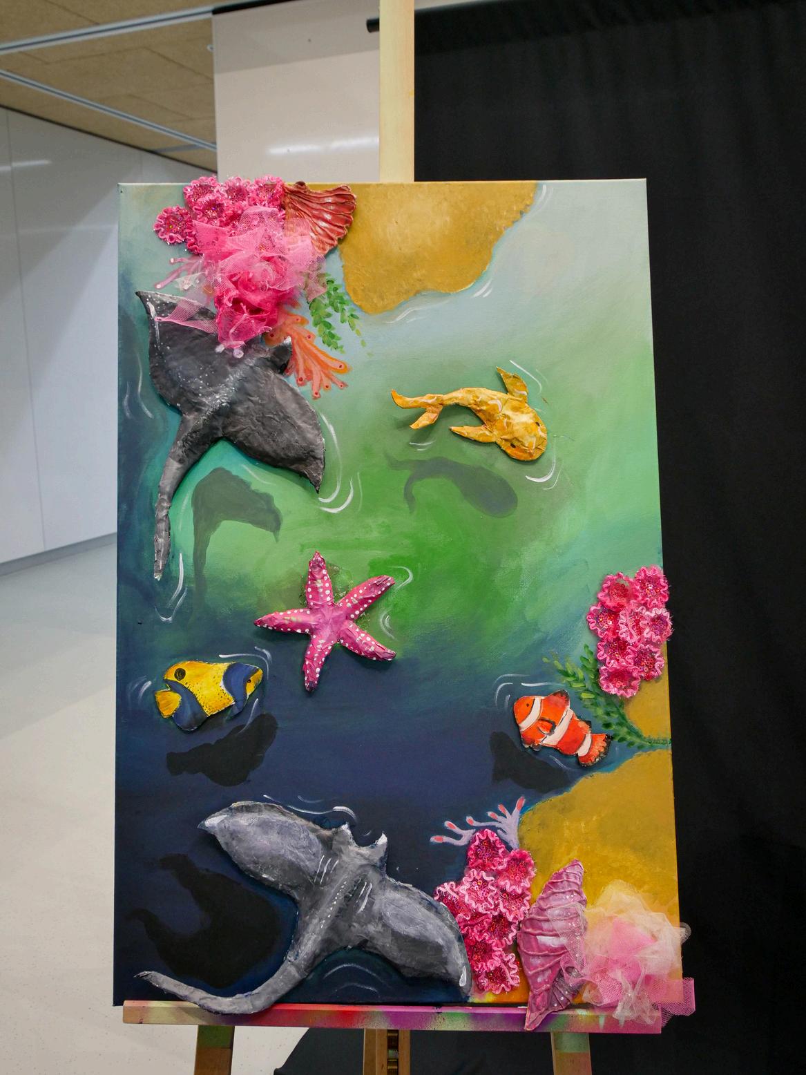 “The Ocean’s Last Story” is a mixed media work that explores the fragile and fading beauty of ocean life My artistic intention was to communicate the emotional impact of seeing marine ecosystems pushed toward extinction due to human activity Through this work, I aim to make the viewer pause and reflect on how modern life is changing the natural world and how we may be witnessing the ocean’s final chapter. The conceptual practice of this work focuses on the idea that the ocean, once full of life and wonder, is now under threat. I wanted to contrast beauty with loss, showing vibrant colours, shapes, and textures that represent coral, sea life, and movement, while also hinting at their disappearance. This sense of vanishing beauty is central to my message. My material practice includes the use of acrylic paint, sculpture elements, and installation components. I chose paint to capture the fluidity and colour of the ocean, and sculptural forms to give the piece a physical, immersive presence The installation aspect allows the viewer to feel surrounded by the work, much like standing inside the ocean itself, but with parts missing, broken, or fading Overall, this work invites the audience to see what we still have, and what we are close to losing It is a visual reminder that unless change happens soon, the ocean’s story may come to an end