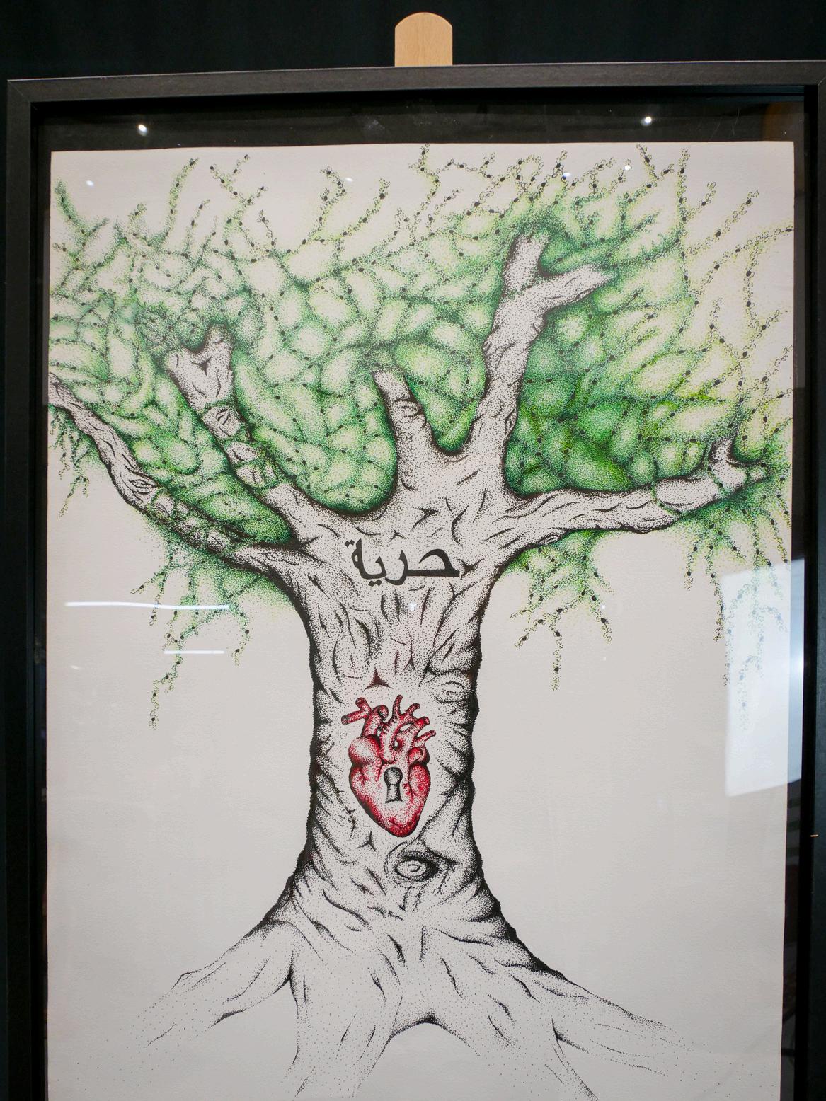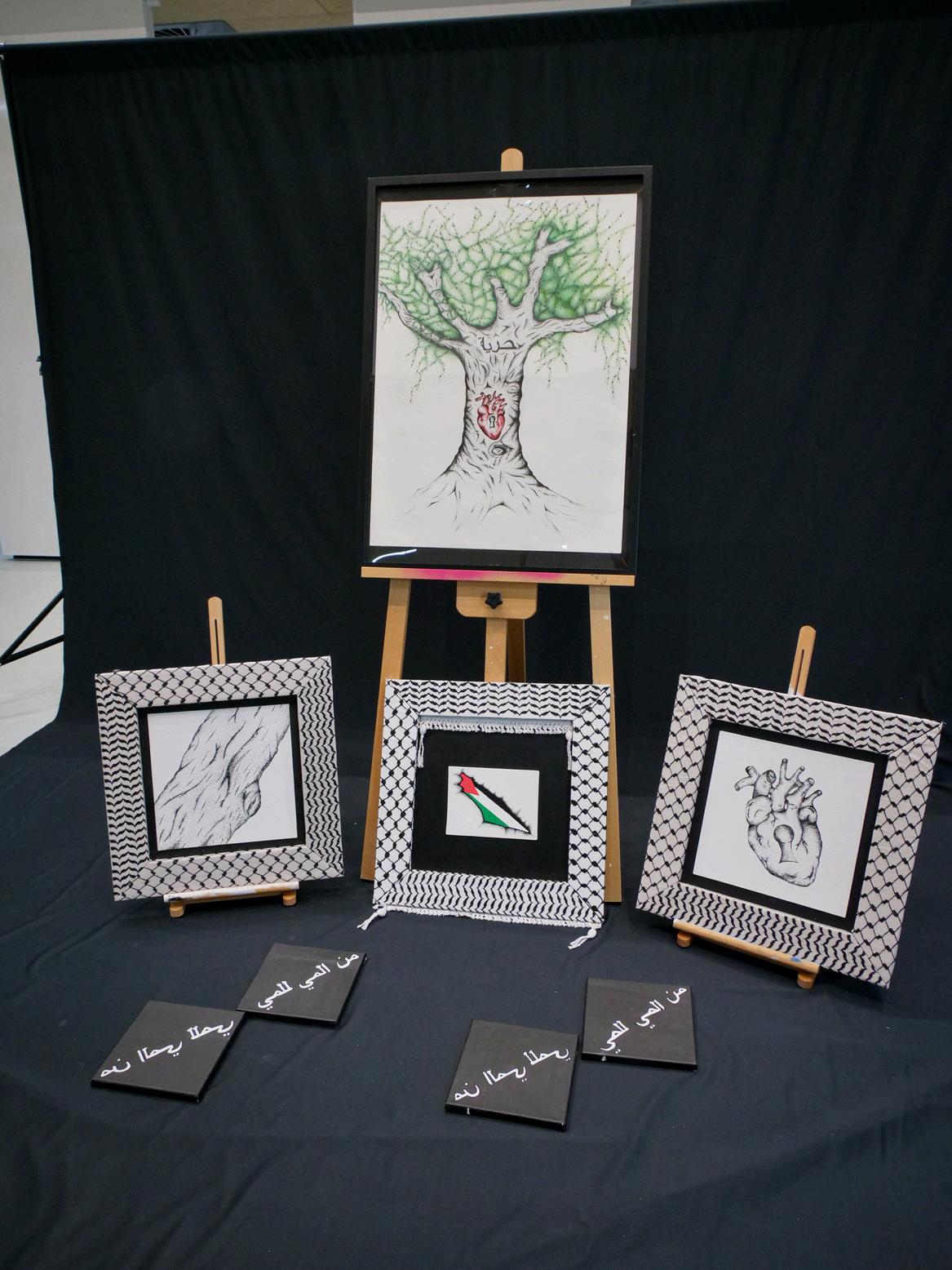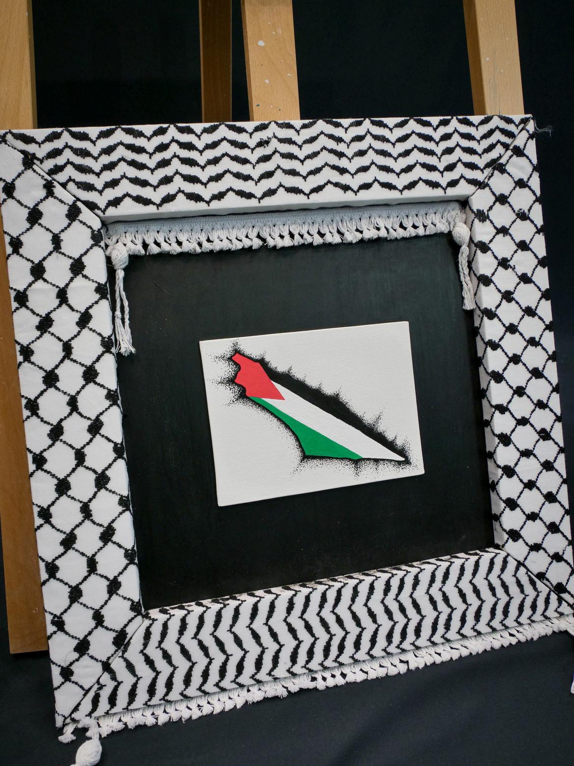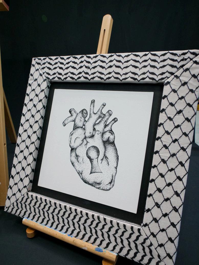 My collection of works titled “Roots of Resistance” delves into the complex and ongoing challenges faced by Palestine, including systemic oppression, limited access to resources, and the misuse of power. Rather than portraying these difficult realities through explicit imagery, I chose to explore the themes through symbolic representation, using the olive tree, the heart, and olives as central icons. These symbols are deeply rooted in Palestinian culture and history, representing resilience, peace, life, and a strong connection to the land. Through these motifs, my work conveys a message of endurance and hope amid adversity. My conceptual practice focuses on expressing the emotional and cultural significance of these symbols, inviting viewers to engage with the narrative on a personal and empathetic level. I aim to highlight the humanity behind the political conflict and encourage reflection on the ongoing struggle without resorting to graphic or confrontational imagery This approach respects the dignity of those affected while emphasising the power of symbolism to communicate profound meaning In terms of material practice, I incorporated timber and textiles to frame the pieces, adding texture and cultural resonance that connect the work to Palestinian craftsmanship and tradition I employed pointillism as my primary technique, creating images through small dots rather than traditional lines This method produces a layered, delicate texture that requires close observation and symbolises the fragmented and complex nature of the situation. Additionally, the integration of text within the works provides context and deepens the narrative, offering viewers a chance to engage more thoughtfully with the themes of identity, loss, and hope.