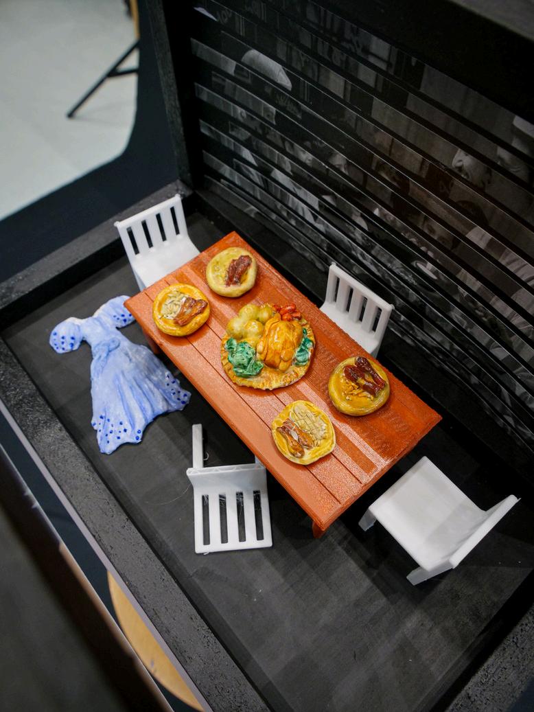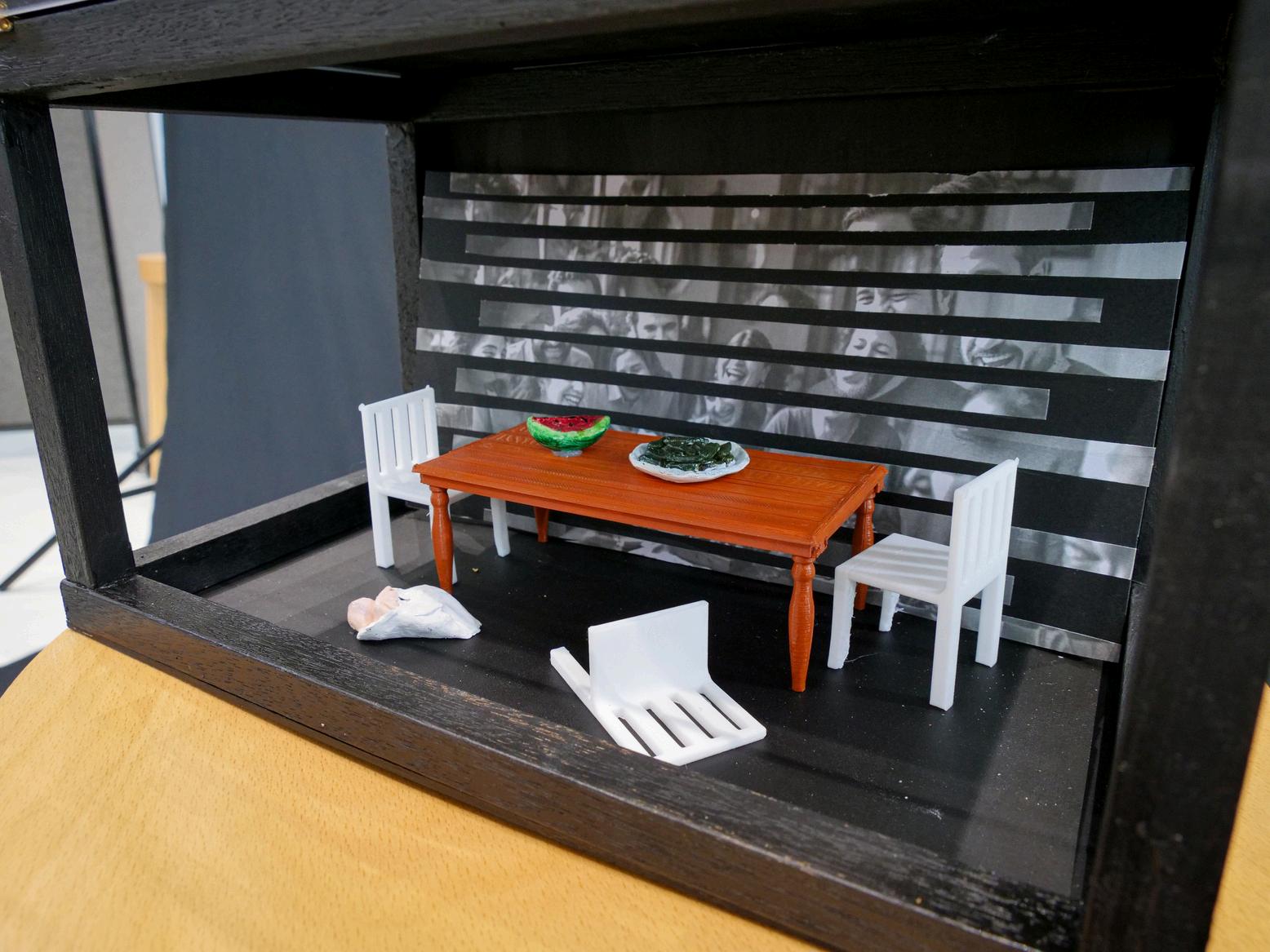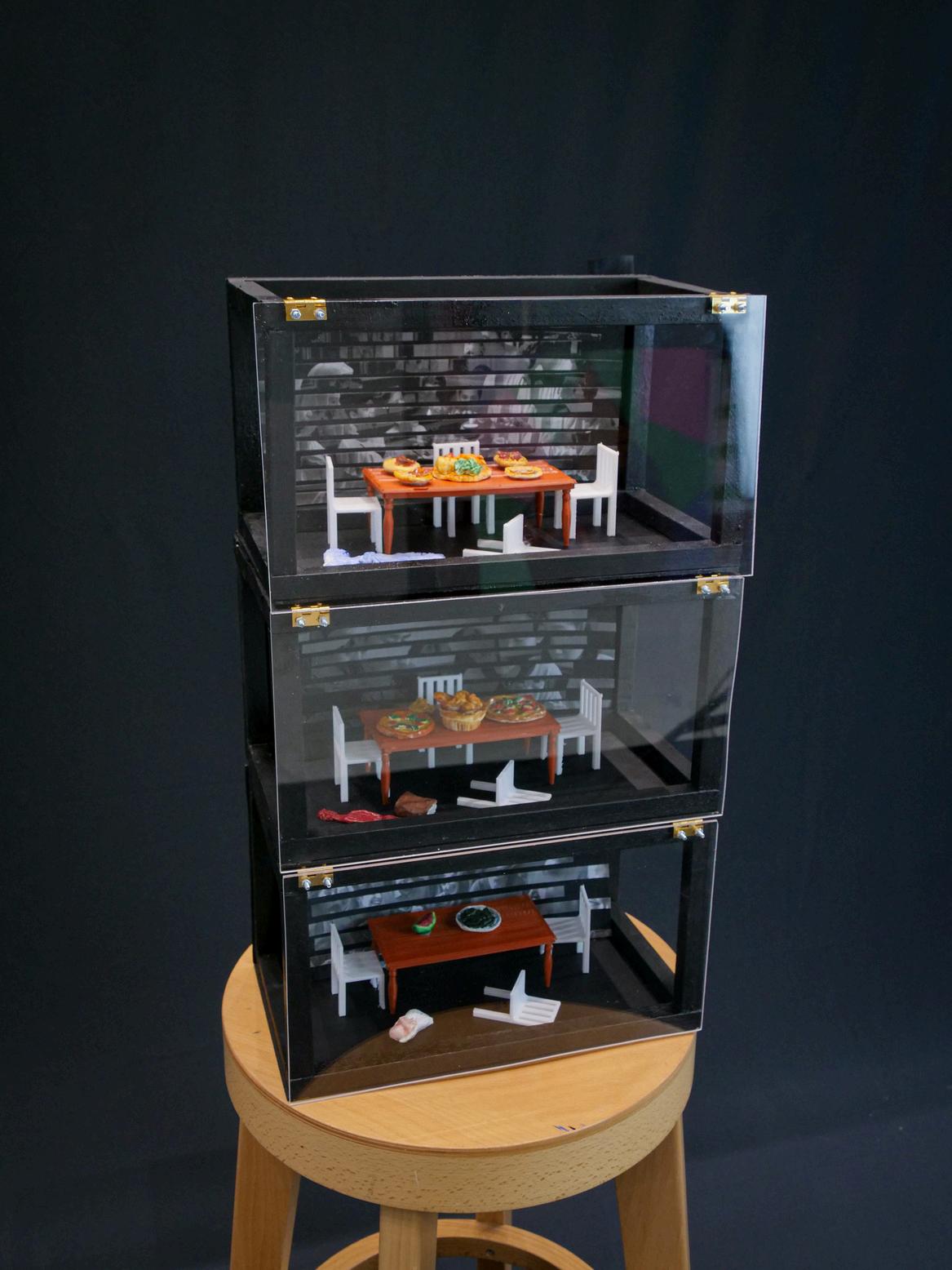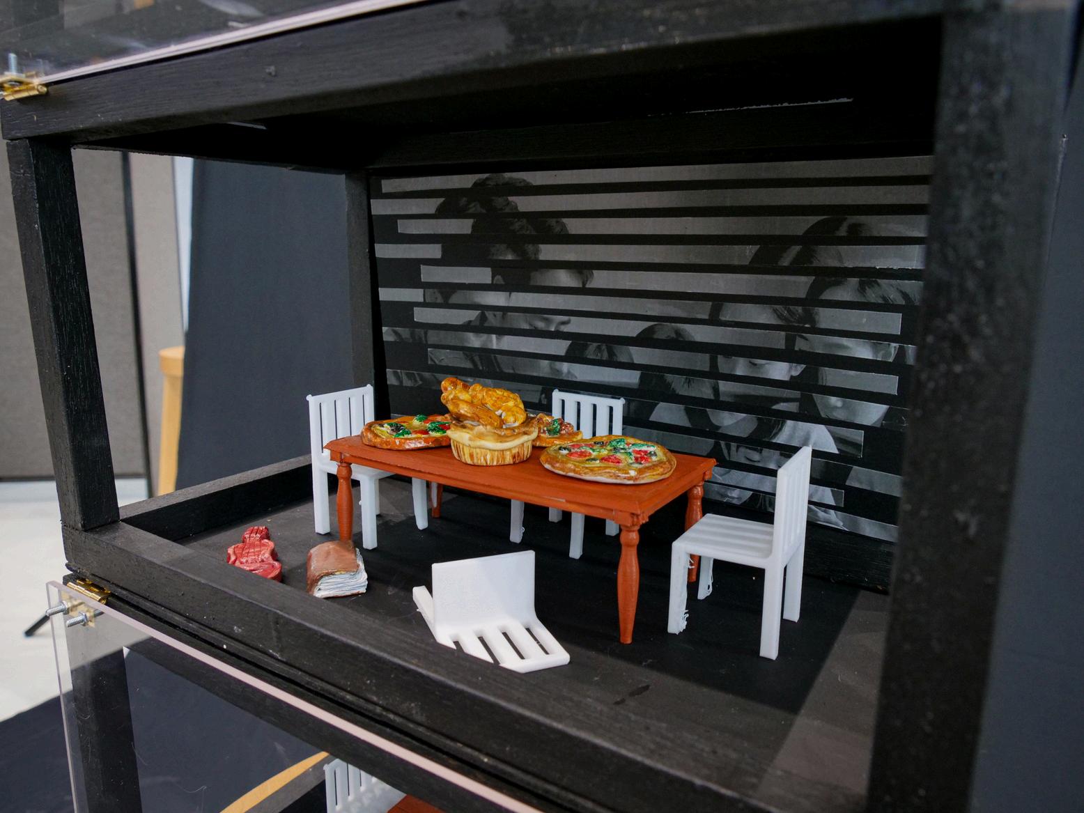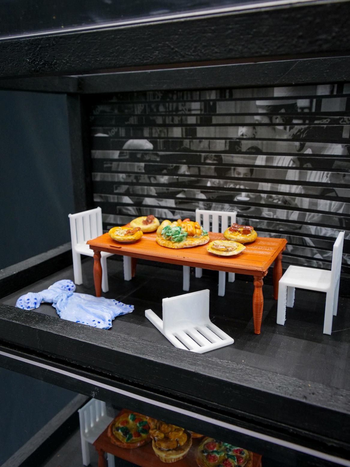 My artwork “A World Aaprt(ment)” is an interactive installation that interrogates the diversity and complexity of domestic life, revealing how individuals inhabiting the same physical environment can possess vastly divergent emotional and cultural realities Comprising six black wooden shadow boxes arranged in a 2x3 grid, each box portrays a distinct family unit, ranging from Indian to Italian and beyond, captured mid-meal in the intimate act of sharing culturally significant dinners. The deliberate inclusion of a pulled-out chair in each scene serves as an invitation for viewers to engage with these private moments, fostering connection without intrusion. Grounded in a conceptual practice that examines cultural identity, emotional fragmentation, and the singularity of domestic experience within communal living spaces, the work combines photography, meticulously hand-sculpted polymer clay representations of meals, watercolor textures, and intricately crafted small-scale 3D printed furnishings. These elements coalesce within three dimensional tableaux encased behind Perspex panels that audiences can physically open and explore Drawing inspiration from artists such as Do Ho Suh, alongside my own multicultural upbringing, this installation prompts contemplation of how proximate physical spaces often belie the profound emotional and cultural separations that exist within communities