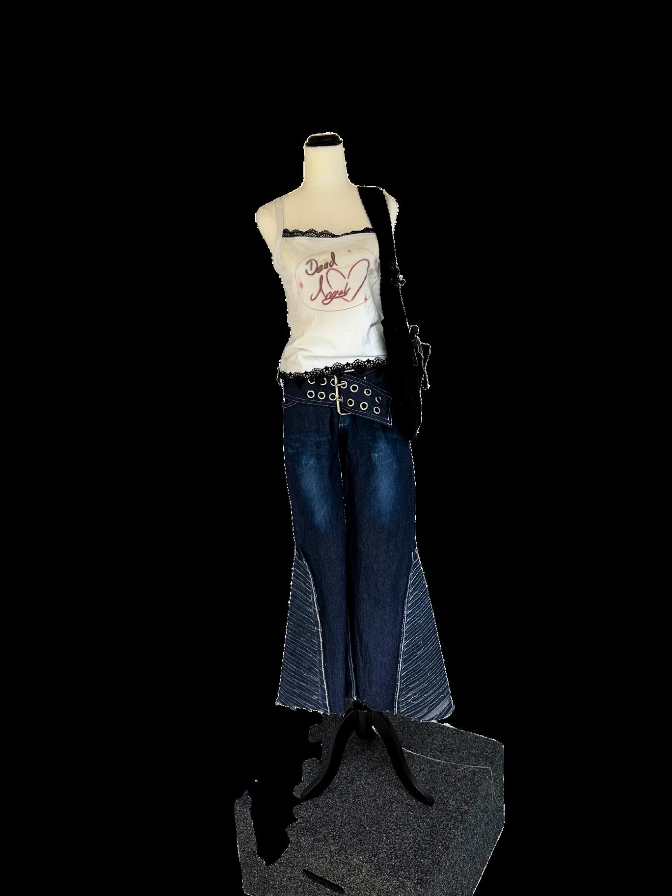 The focus area for my Major Textiles Project (MTP) is an apparel outfit consisting of a printed graphic, lace tank top, decorated bellbottom jeans with a wide denim belt, a studded pleather belt and a lined crochet bag with the intended end use being everyday streetwear. The apparel outfit is primarily inspired by the controversial Bratz dolls, specifically ‘Bratz Rock Angelz’ use of decorated flared bellbottoms and a printed top These are embellished by creative techniques like embroidery, printed designs, studs, etc. These aesthetic elements contribute to a feminine and grunge/punk rock connotation that appeals to the nostalgia surrounding Bratz dolls in the 2000s. These subculture connotations allow the wearer to identify and express ideological beliefs surrounding female empowerment through the pink design elements and anti-establishment, through the embellished studs and distressed denim. This allows a unique and individual look due to the handmade value of the crochet bag with Japanese inspired sashiko-boro pockets and hand embroidery on the back pant pockets. The hand-made aspects of the crochet bag and hand-embroidered pockets communicate a value for environmental sustainability that opposes mass production of fast fashion brands, contributing to the antiestablishment ideological value.