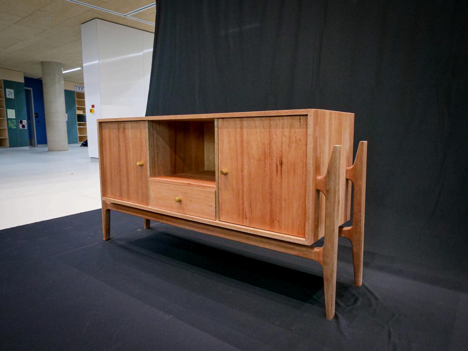 For my Industrial Technology Timber major project, I have chosen to design and construct a modern table to display a vinyl player and records featuring a floating leg design, two cupboards positioned symmetrically on each side, a half drawer in the centre, and an open shelf above the drawer My intention is to create a piece of furniture that not only looks visually striking but also offers practical storage solutions for everyday use The floating leg effect is one of the main design features and is something I was inspired to try after researching contemporary furniture trends It gives the table a lighter, more refined appearance compared to traditional leg designs, which often make a piece feel bulky or heavy Achieving this effect will require careful planning of the internal bracing and precise construction to ensure the table remains strong and stable while maintaining the illusion of weightlessness Functionality is just as important as appearance in this design The two cupboards will provide enclosed storage for vinyl racks, keeping them out of sight and maintaining the table’s clean, uncluttered look. The half drawer in the middle is designed for smaller items such as extra cables, vinyl pins, and owner manuals. Above the drawer, I have included an open shelf space, which can be used to display collectibles related to music for aesthetic purposes.
