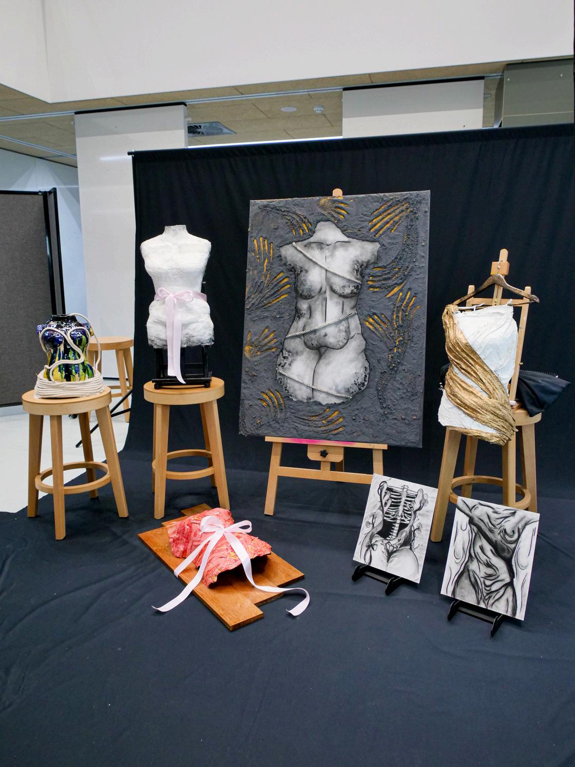 My BOW “Bound Innocence" explores the often unseen and silenced experience of domestic violence against women. The series includes a range of forms and materials, charcoal drawings of torsos, hand-built clay sculptures, and resin castings, all of which work together to convey vulnerability, pain, and resilience. The use of charcoal allowed me to create raw, expressive depictions of the female body, stripped back to reveal emotional fragility. These works are intentionally incomplete or fragmented, symbolising the disempowerment and erasure of identity that often occurs in violent domestic environments. Moving into three-dimensional form, I used clay to create delicate yet grounded sculptural figures that appear both strong and damaged Resin was chosen for its contrast with its smooth, glassy surface concealing internal cracks and distortion to suggest how domestic violence is often hidden beneath the surface of everyday life My material practice involved careful experimentation with texture, weight, and form to reflect the emotional complexities of these experiences. Conceptually, this work focuses on making the invisible visible. Domestic violence is frequently ignored or minimised by society, yet its impact is profound and far-reaching. By placing the viewer in close proximity to these silent figures, I hope to create space for reflection, recognition, and deeper understanding. This series is not about shock, but about humanising the issue offering a sensitive, multilayered perspective that encourages empathy and awareness.