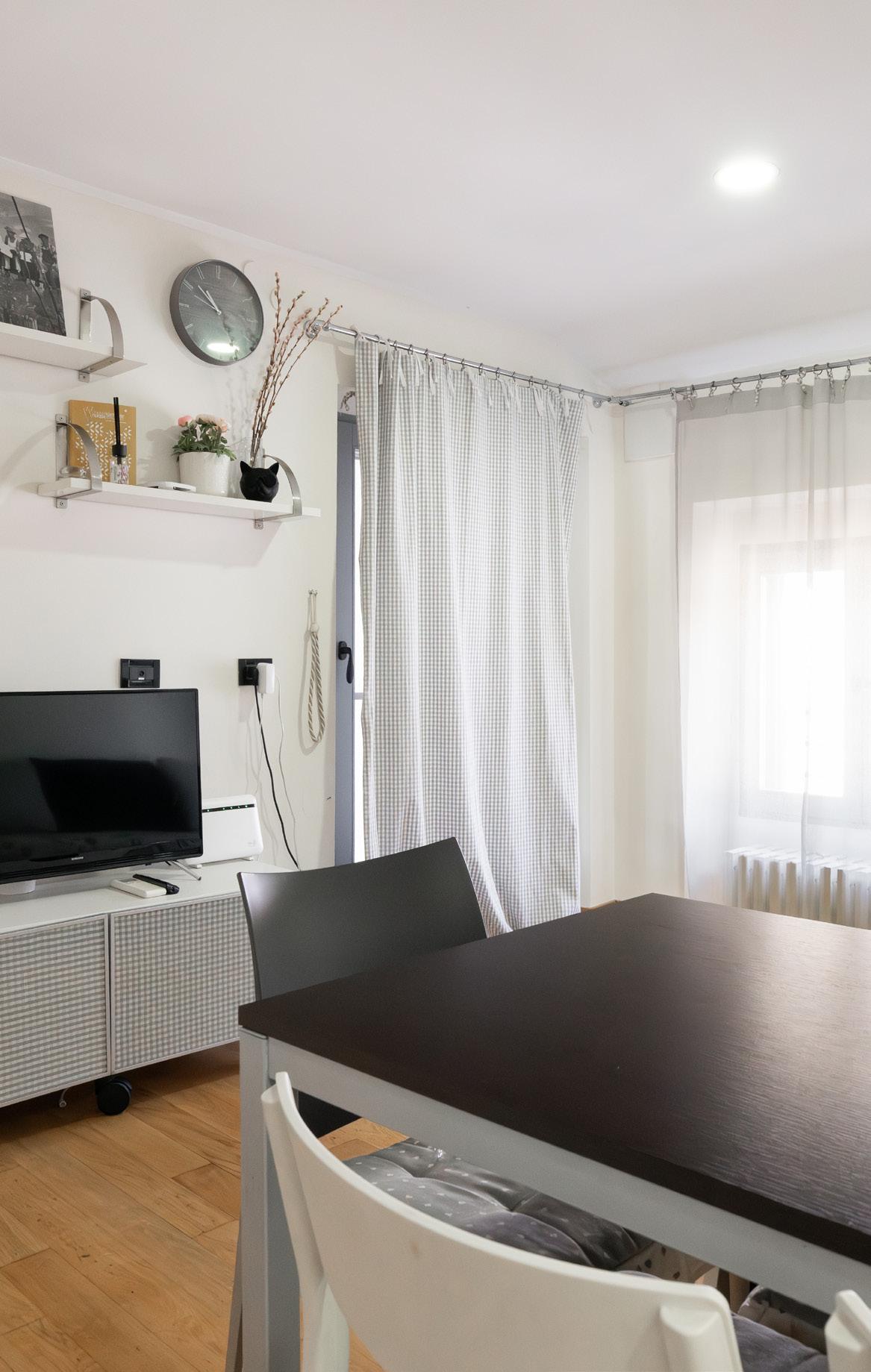 Il soggiorno accoglie con calore grazie al parquet in legno, alle pareti chiare e alla grande finestra che affaccia sul cortile interno. La disposizione degli arredi valorizza lo spazio, offrendo una zona relax e un’area pranzo ben definite. Le travi a vista e i dettagli originali dell’edificio dialogano con la ristrutturazione recente, creando un ambiente accogliente, perfetto per chi cerca un luogo da vivere e non solo abitare.