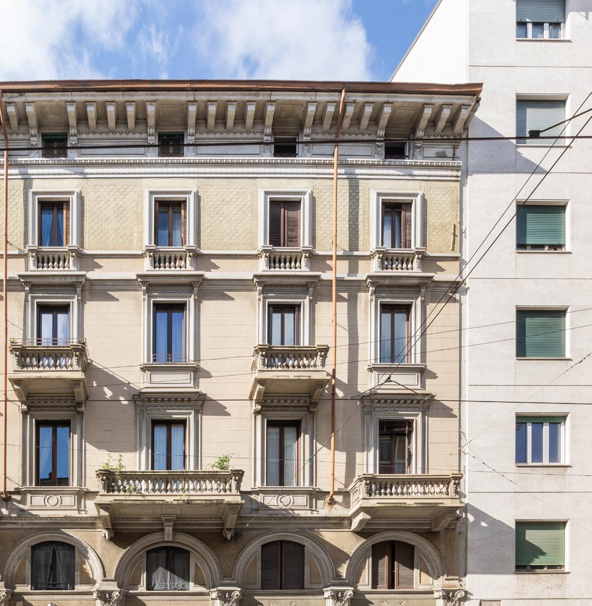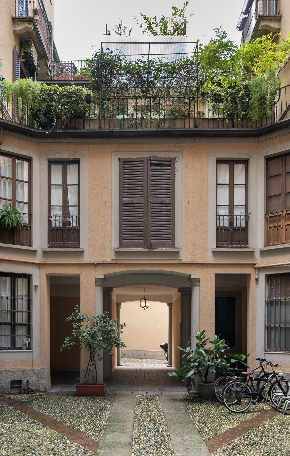 Lo stabile conserva l’autenticità delle case milanesi di primo Novecento: ingresso in pietra, vano scala curato, portone storico e cortile interno con pavimentazione in ciottoli e piante ornamentali. Le parti comuni sono in ordine, silenziose e curate, e restituiscono quell’atmosfera di quiete che sorprende chi entra dalla frenesia di Corso Genova.