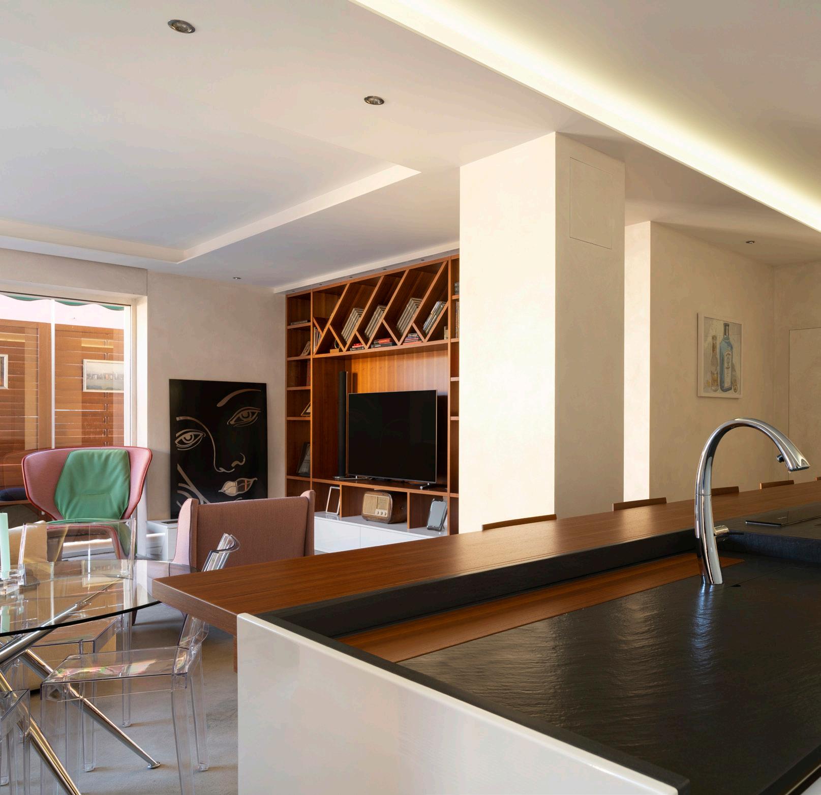 La cucina a vista, completata con elettrodomestici Miele di ultima generazione, si fonde elegantemente con la zona living, divenendo il fulcro centrale di questa residenza.