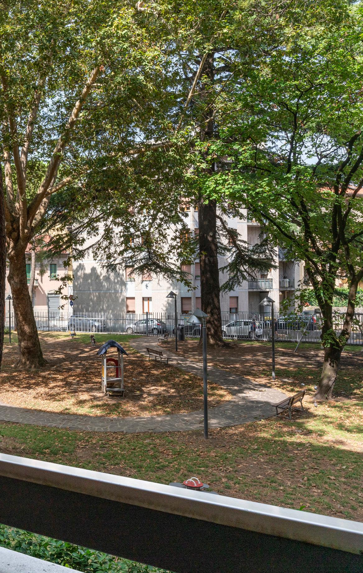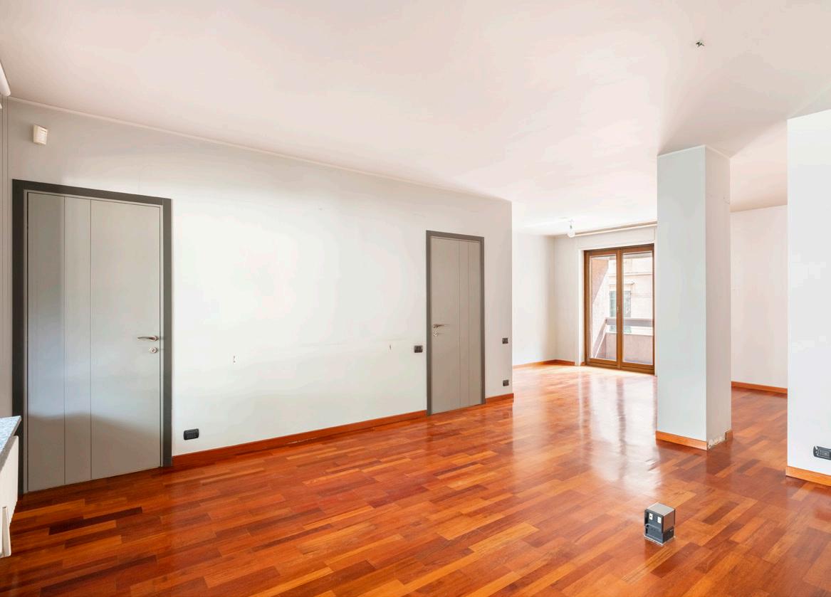 Il salone doppio, con le sue ampie vetrate, si apre su un lungo terrazzo che domina il giardino musicale: un incantevole spazio di gioco a tema musicale, circondato da alberi maestosi. Questo appartamento è impreziosito da un’originale soluzione architettonica per il terrazzo, che vi permetterà di godervi al massimo gli spazi esterni.