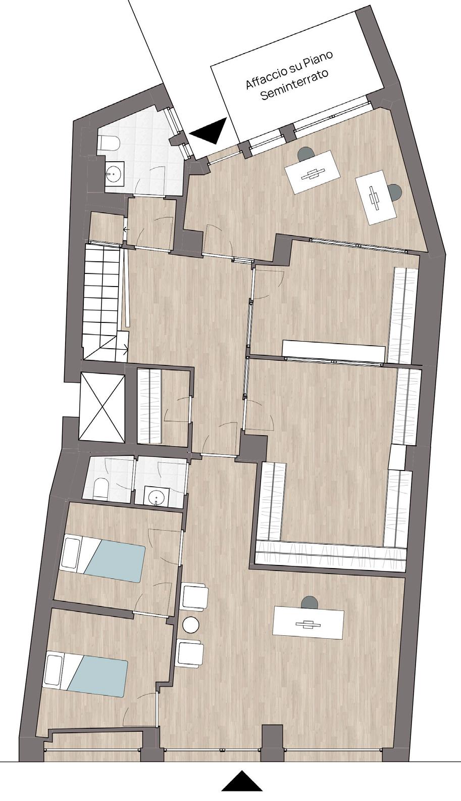 Il piano terra di 116 mq accoglie i clienti in un ambiente moderno e ben organizzato. La zona reception, luminosa e professionale, crea il primo impatto perfetto. Le stanze, distribuite in modo funzionale, si prestano a diverse attività commerciali, garantendo flessibilità e praticità.