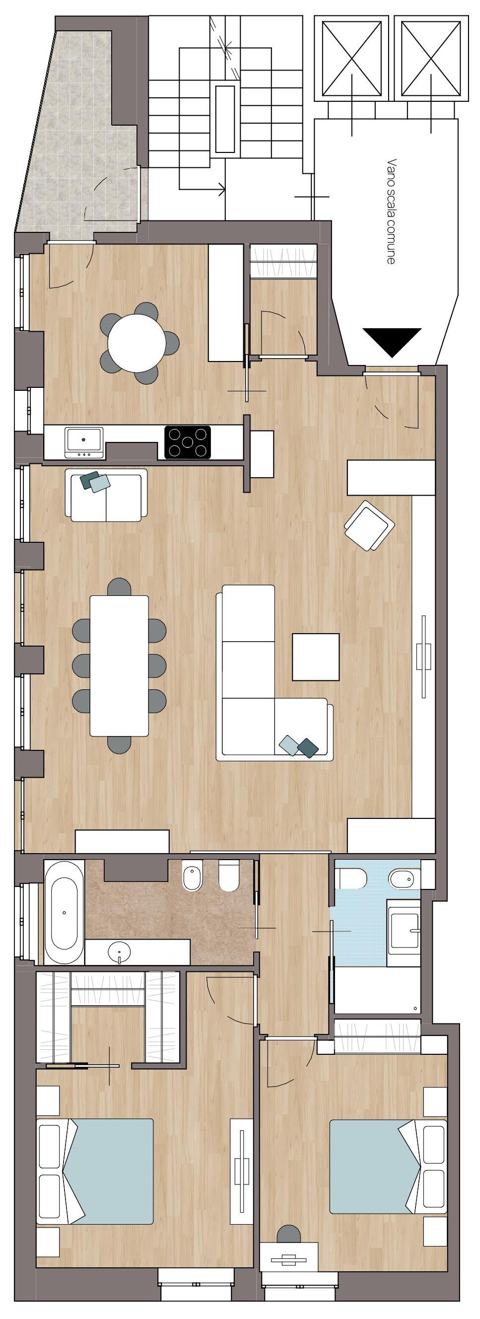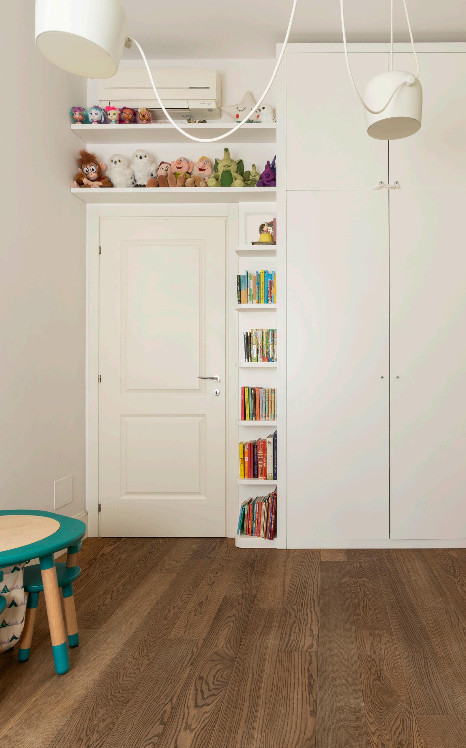 Le due camere da letto sono ampie, silenziose e ben distribuite, pensate per offrire comfort e privacy a ogni componente della famiglia. La tripla esposizione garantisce luce naturale durante l’intera giornata, mentre il parquet caldo e uniforme ne esalta la vocazione residenziale. Una delle stanze può facilmente adattarsi a studio, stanza per gli ospiti o camera dei ragazzi, offrendo versatilità e valore aggiunto all’intera abitazione.