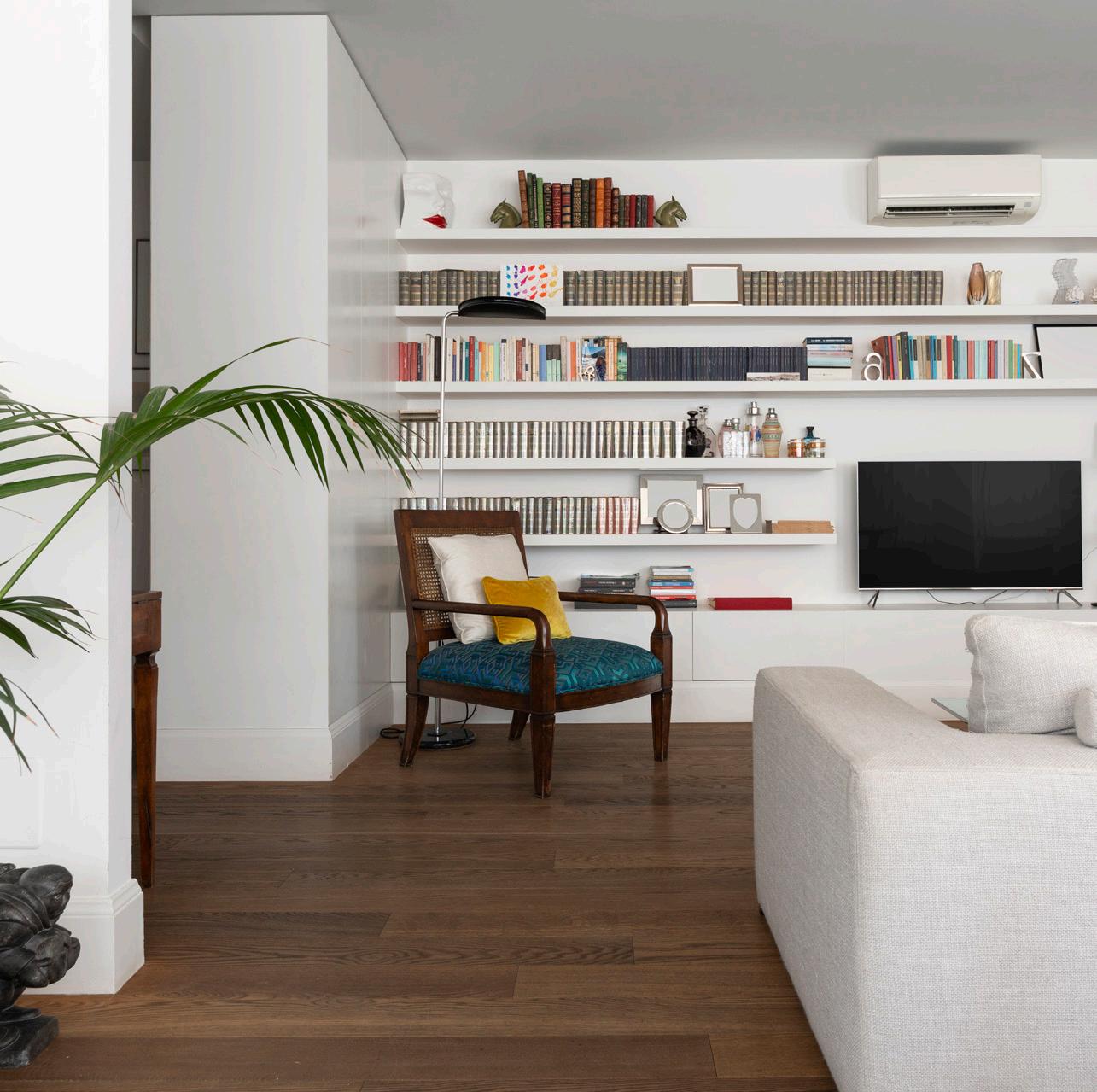 Il soggiorno è il centro gravitazionale della casa: ampio, arioso, e inondato di luce naturale grazie alla favorevole esposizione a sud e ovest. Gli spazi si aprono in modo fluido, con una zona conversazione e relax accogliente, pronta a trasformarsi in luogo di rappresentanza o in rifugio quotidiano. Il parquet, posato con eleganza, amplifica la sensazione di calore e continuità visiva, mentre la sobrietà delle finiture consente la massima personalizzazione dell’arredo.