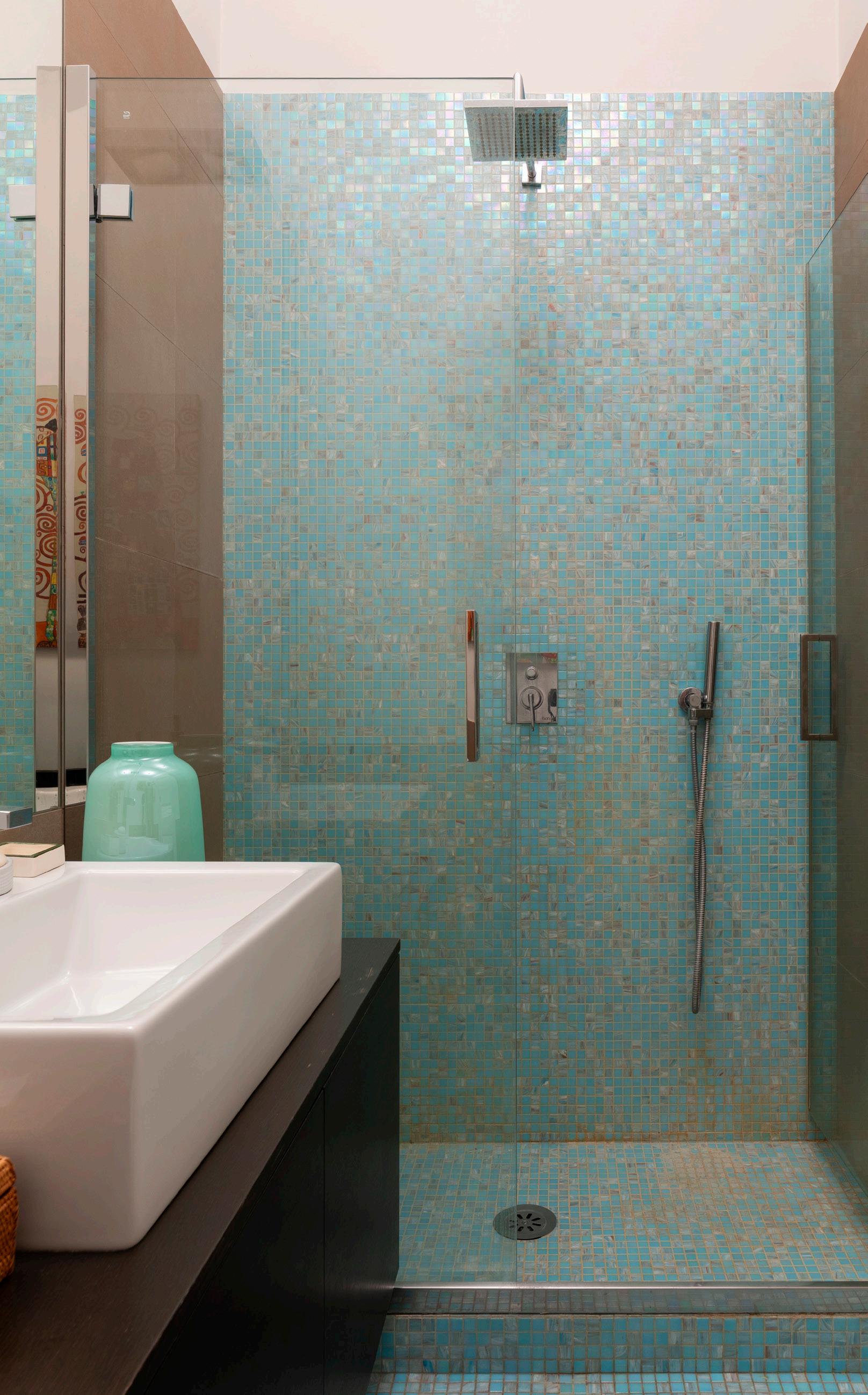 piastrelle a tutta altezza, sanitari moderni e cabina doccia in cristallo