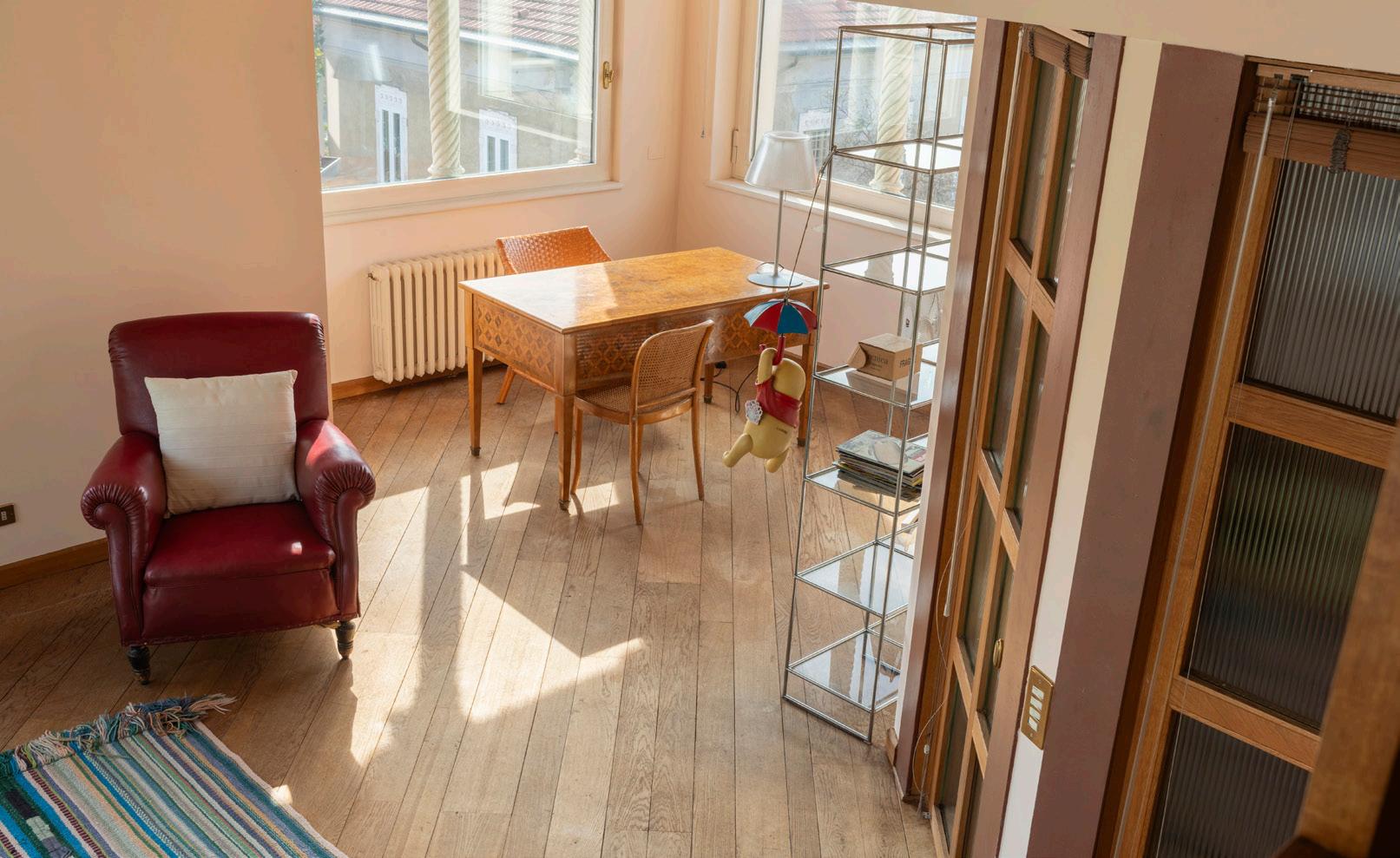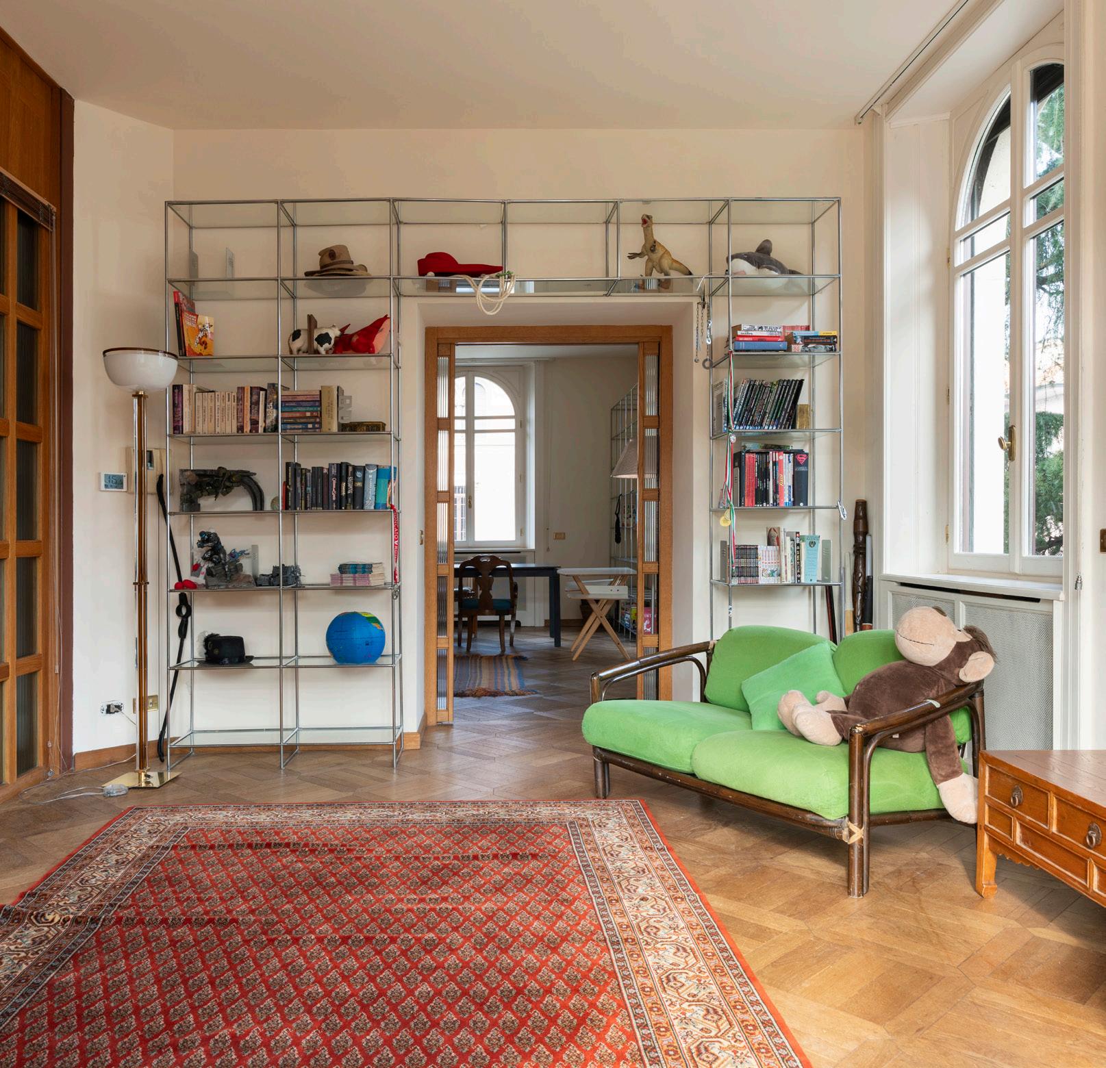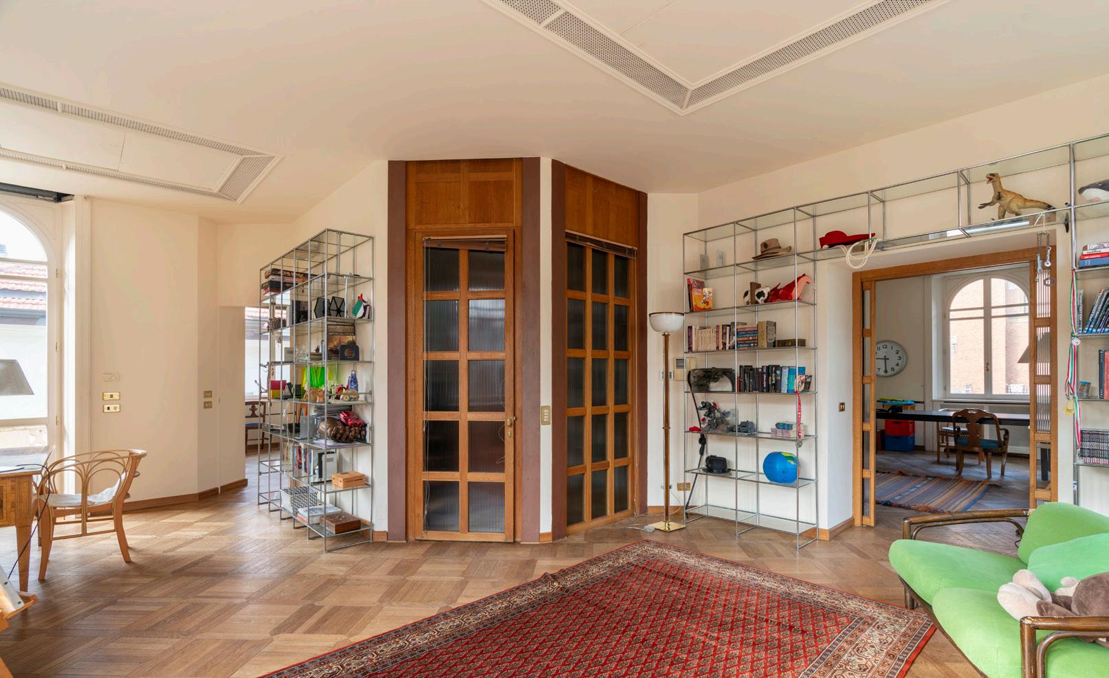 Il primo piano ospita una zona giorno di grande impatto scenico. Il soggiorno doppio, impreziosito da grandi vetrate e librerie a tutta parete, è un ambiente pensato per momenti di convivialità e relax. Il parquet originale, i dettagli in legno e gli elementi architettonici caratterizzano uno spazio in cui l’eleganza incontra la funzionalità. Un ambiente luminoso, ampio e perfettamente bilanciato tra intimità e rappresentanza.