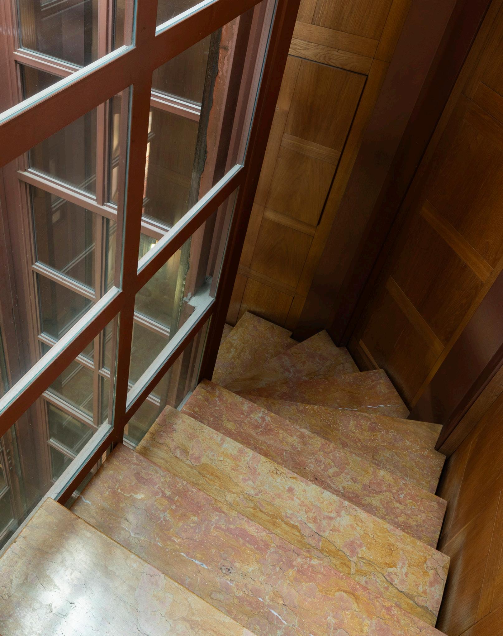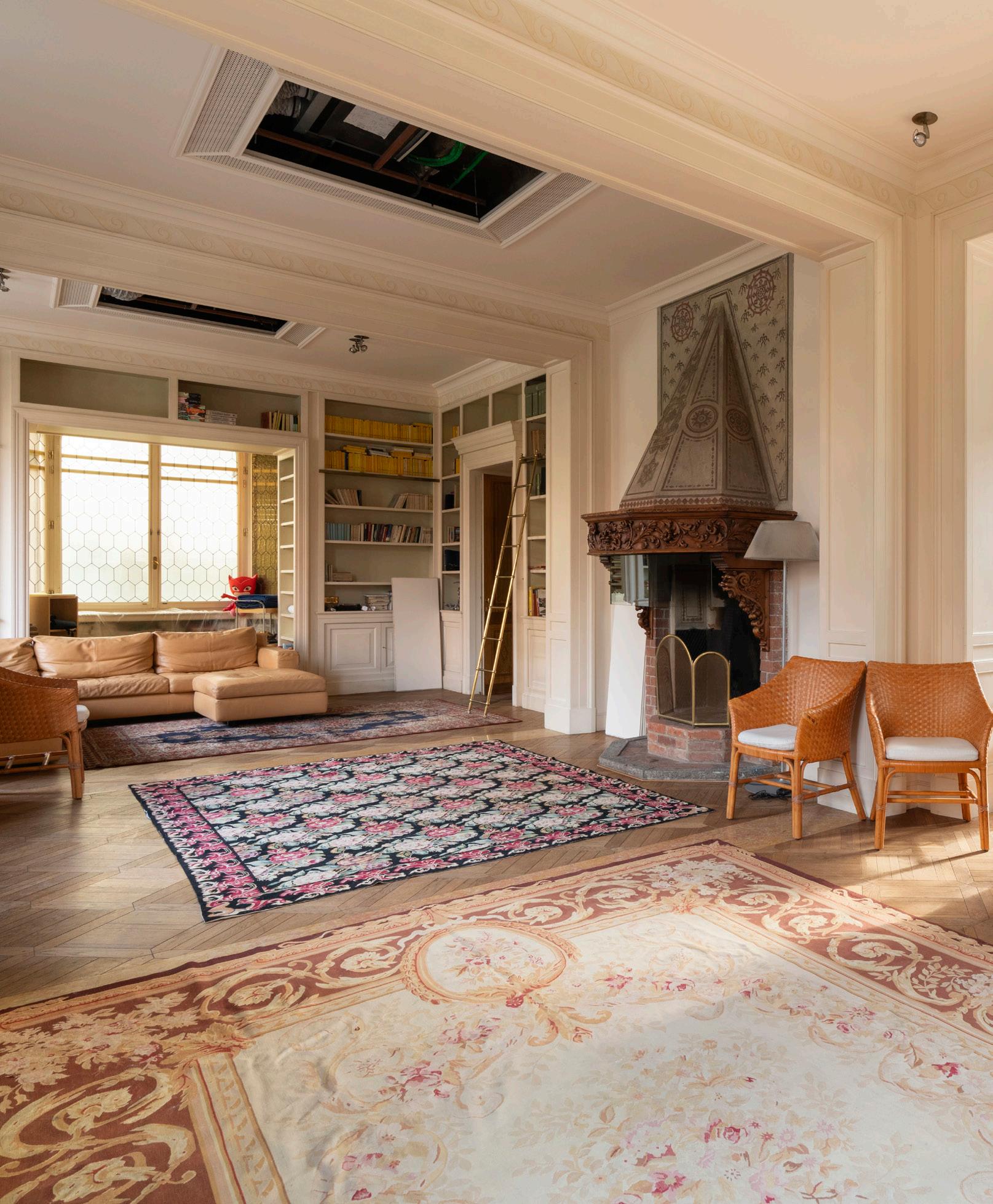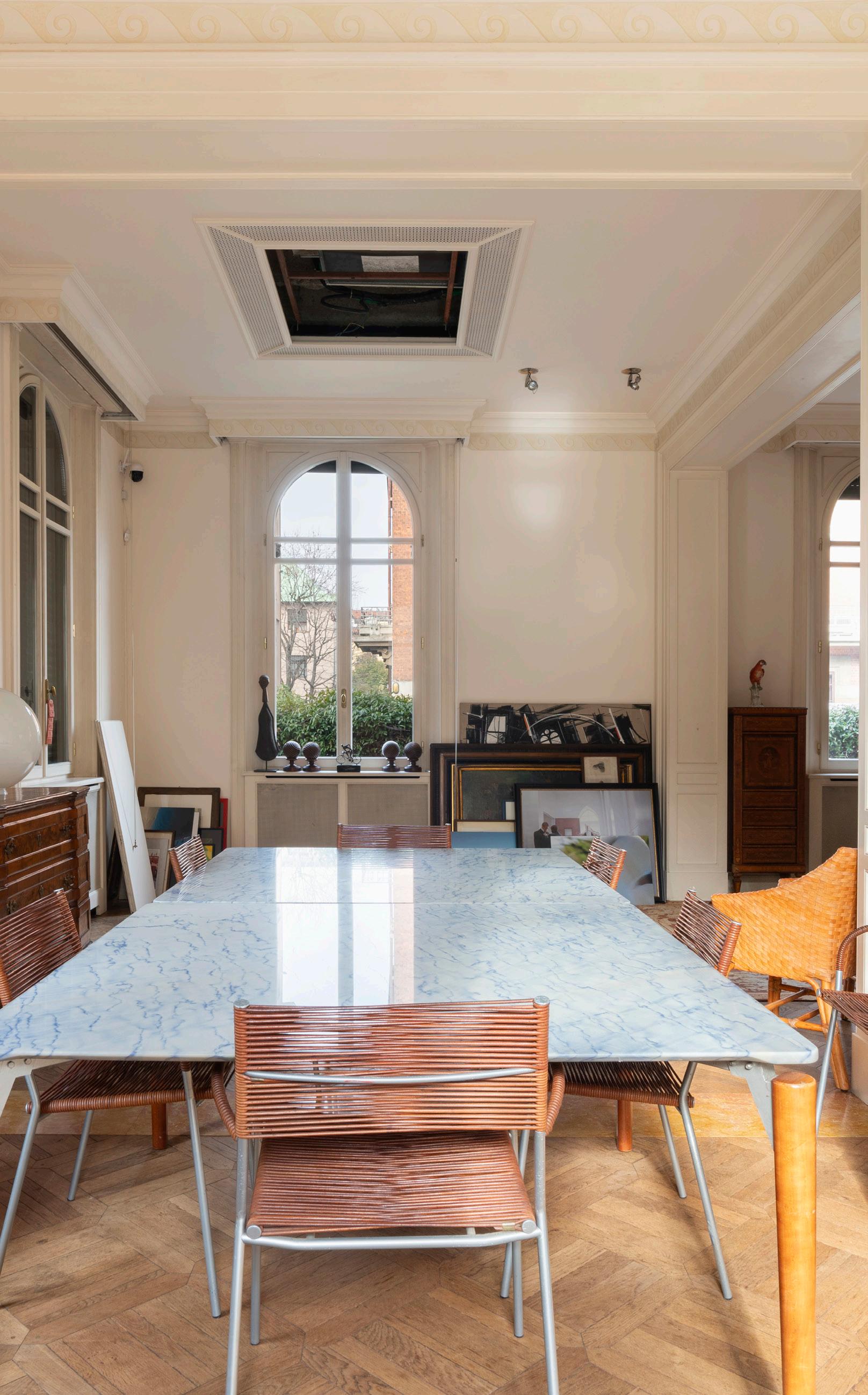 Il primo piano ospita una zona giorno di grande impatto scenico. Il soggiorno doppio, impreziosito da grandi vetrate e librerie a tutta parete, è un ambiente pensato per momenti di convivialità e relax. Il parquet originale, i dettagli in legno e gli elementi architettonici caratterizzano uno spazio in cui l’eleganza incontra la funzionalità. Un ambiente luminoso, ampio e perfettamente bilanciato tra intimità e rappresentanza.