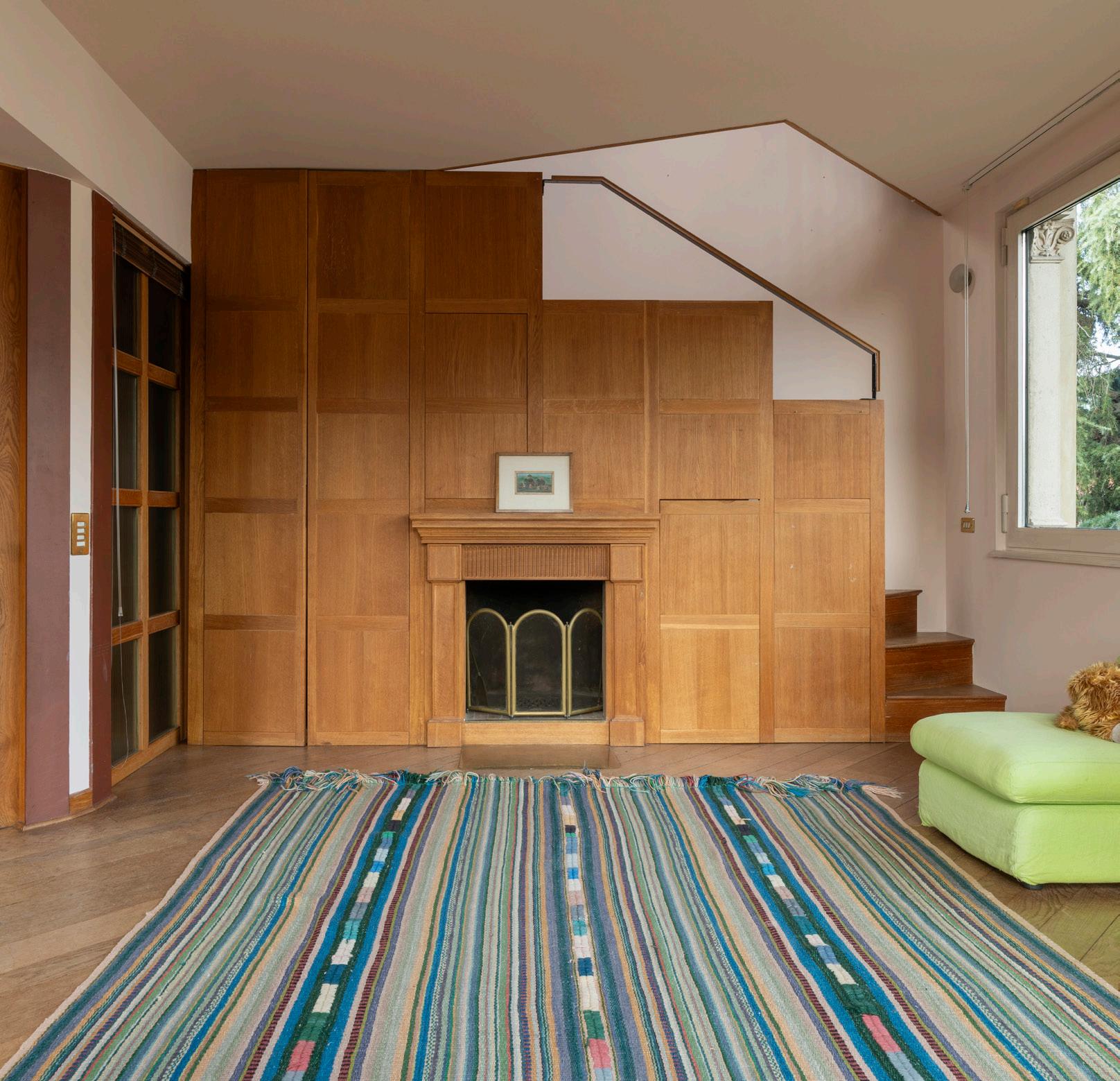 Al secondo piano, un ambiente ampio e accogliente si presta a molteplici interpretazioni. Il protagonista è il camino, incorniciato da un’elegante struttura in legno, che dona calore e atmosfera alla stanza. Le grandi finestre incorniciano il verde degli esterni e riempiono lo spazio di luce naturale, valorizzando i dettagli architettonici e le finiture originali. Un angolo versatile, perfetto come studio, area relax o zona lettura, dove il fascino della villa incontra il comfort contemporaneo.