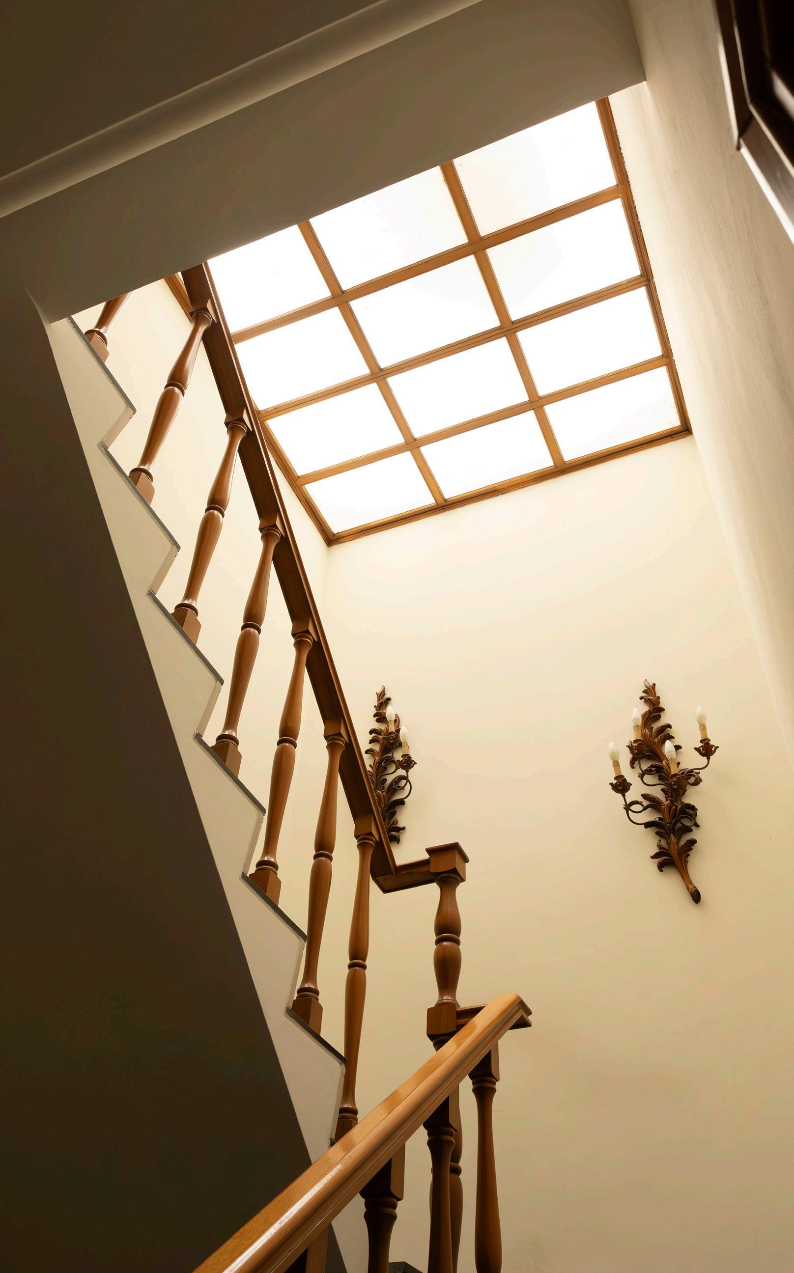 lucernario in vetro opalino incorniciato da griglia in legno naturale